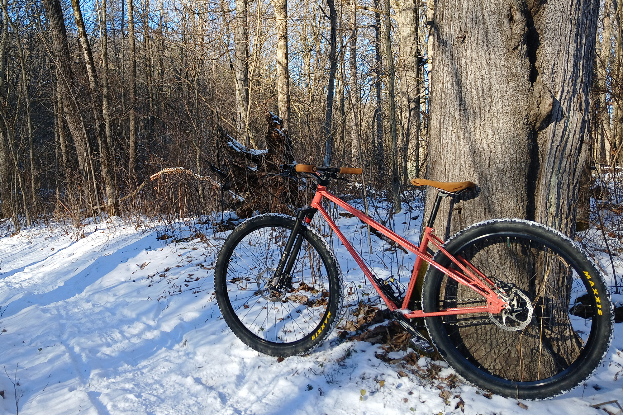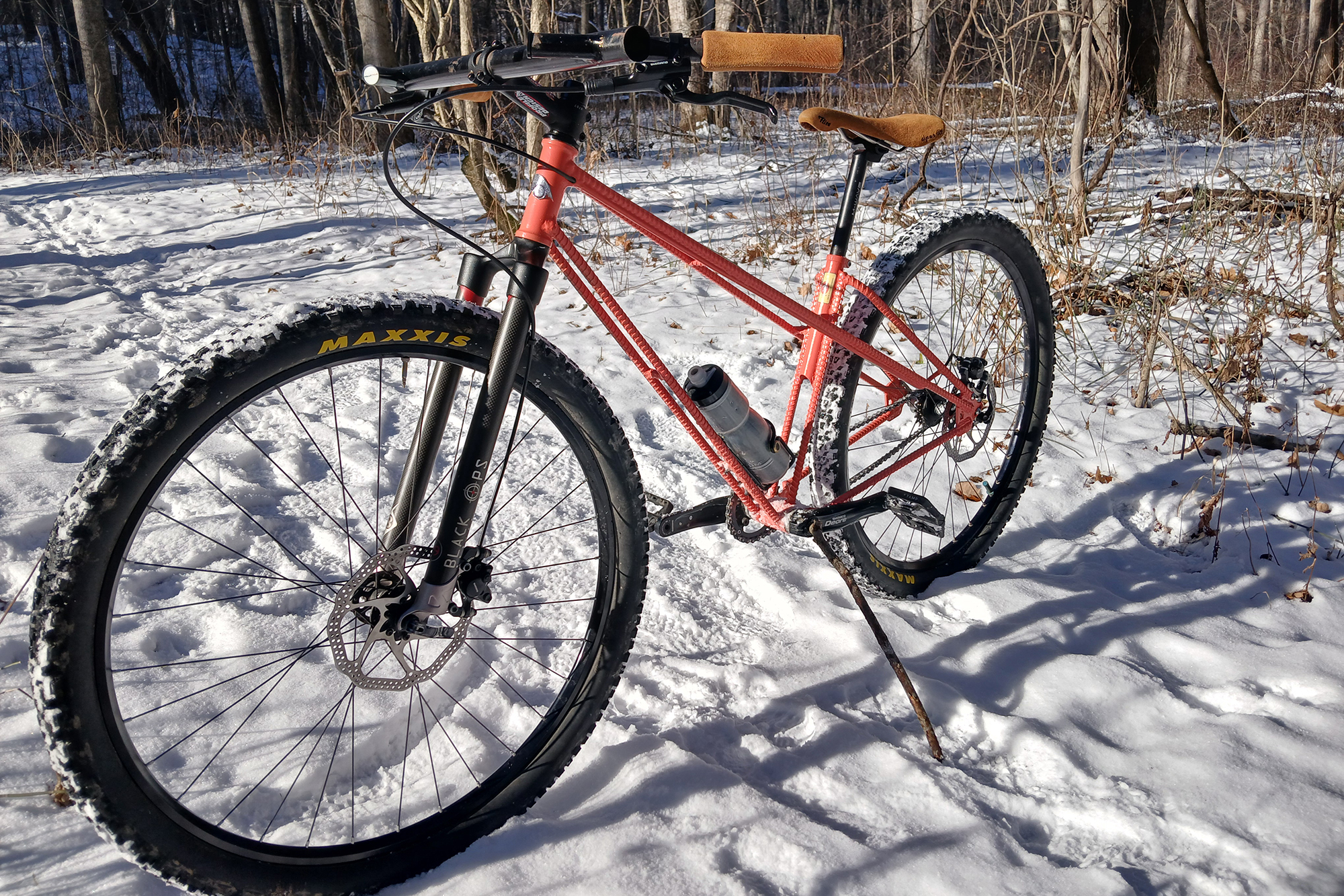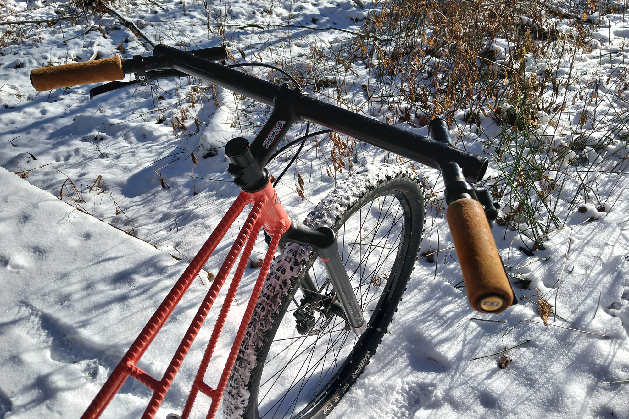 Now I know it’s awesome to see sweet eye candy on fresh new frame builds but I’m also a believer in using parts I already have or good used parts. Plus I’m a tightwad and broke so I dug into my stash or pulled from other two wheeled cadavers hanging from my rafters. Simplicity is a huge factor in my builds…no suspension, no derailleurs, no dropper, no thru axle, nothing wider than 135mm spacing. Call me an old dated curmudgeon stuck in the past but we have so many perfectly good parts already out there that people deem obsolete because they’re not of the latest and greatest. One man gathers what another man spills. The bars are my own custom pieces I called the “Go Pharr Bar”.