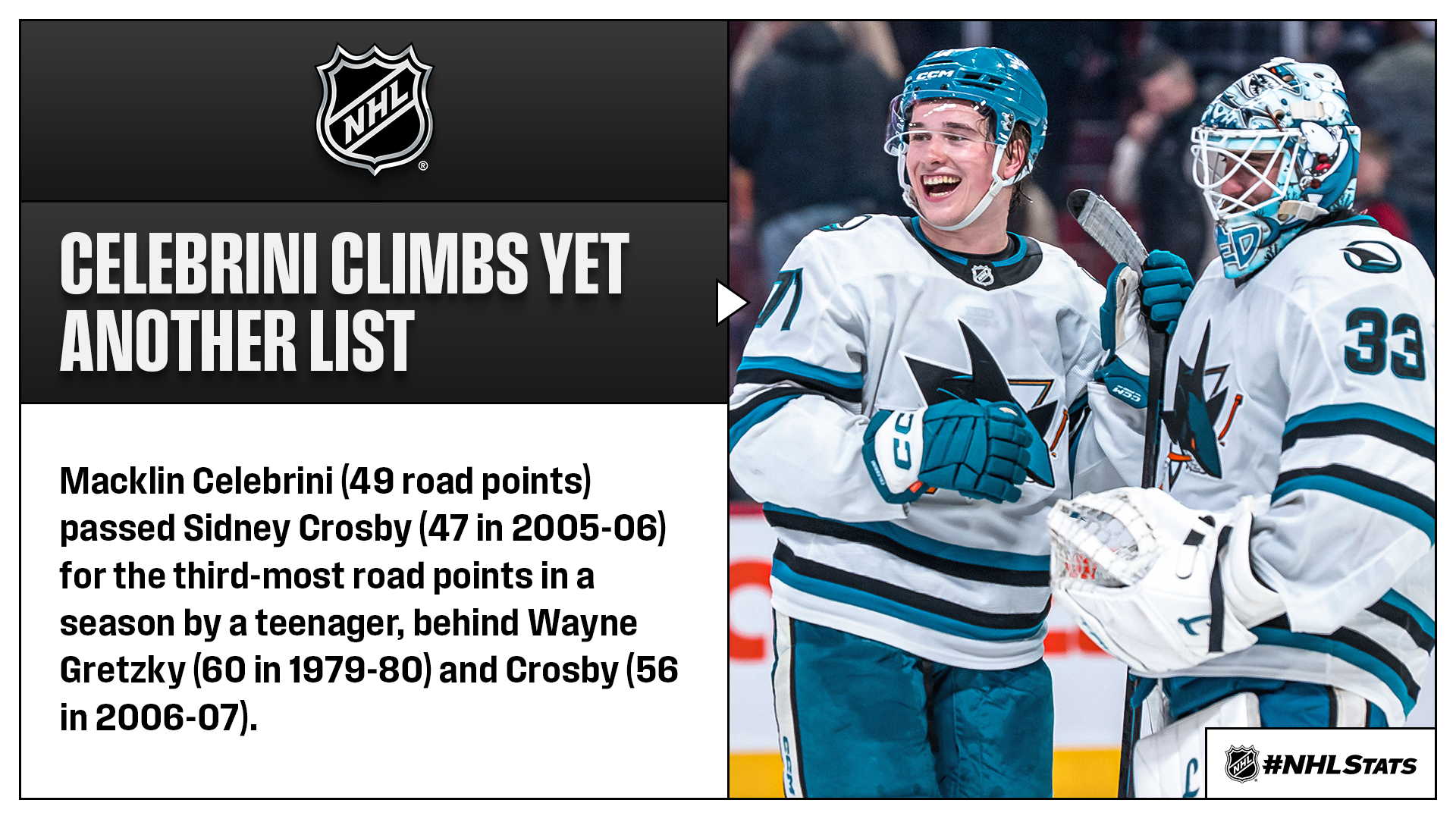 * Macklin Celebrini (2-1—3) recorded his 15th three-point game of 2025-26 and helped the Sharks (32-26-6, 70 points) jump past the Kings (27-24-15, 69 points) for the second Wild Card spot. He tied Nikita Kucherov for the second-most three-point outings this season behind Nathan MacKinnon (17) and surpassed Joe Thornton (14 in 2005-06) for the second most in a campaign by a Sharks player. Thornton (18 in 2006-07) tops that list.