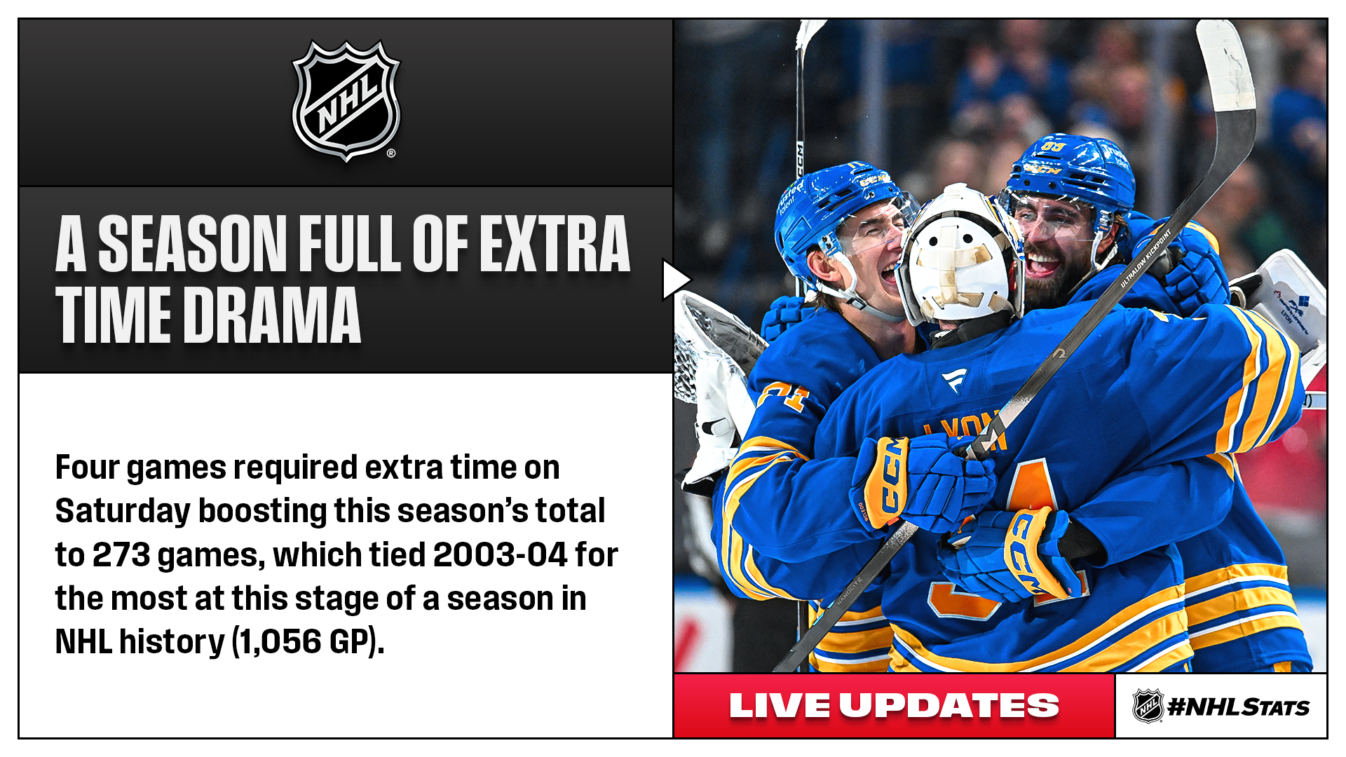 * Buffalo (41-20-6, 88 points) earned the shootout win over Toronto and built a four-point cushion over Tampa Bay (40-21-4, 84 points) for first in the Atlantic Division. The Sabres improved to 3-0-1 against the Maple Leafs in their final meeting this season. The last campaign Buffalo finished without a regulation loss to Toronto was 1997-98 (1-0-1).