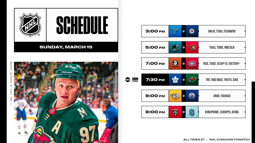* The weekend continues with a six-game Sunday that includes a national broadcast across the U.S. on TNT which pits the Maple Leafs against the Wild.