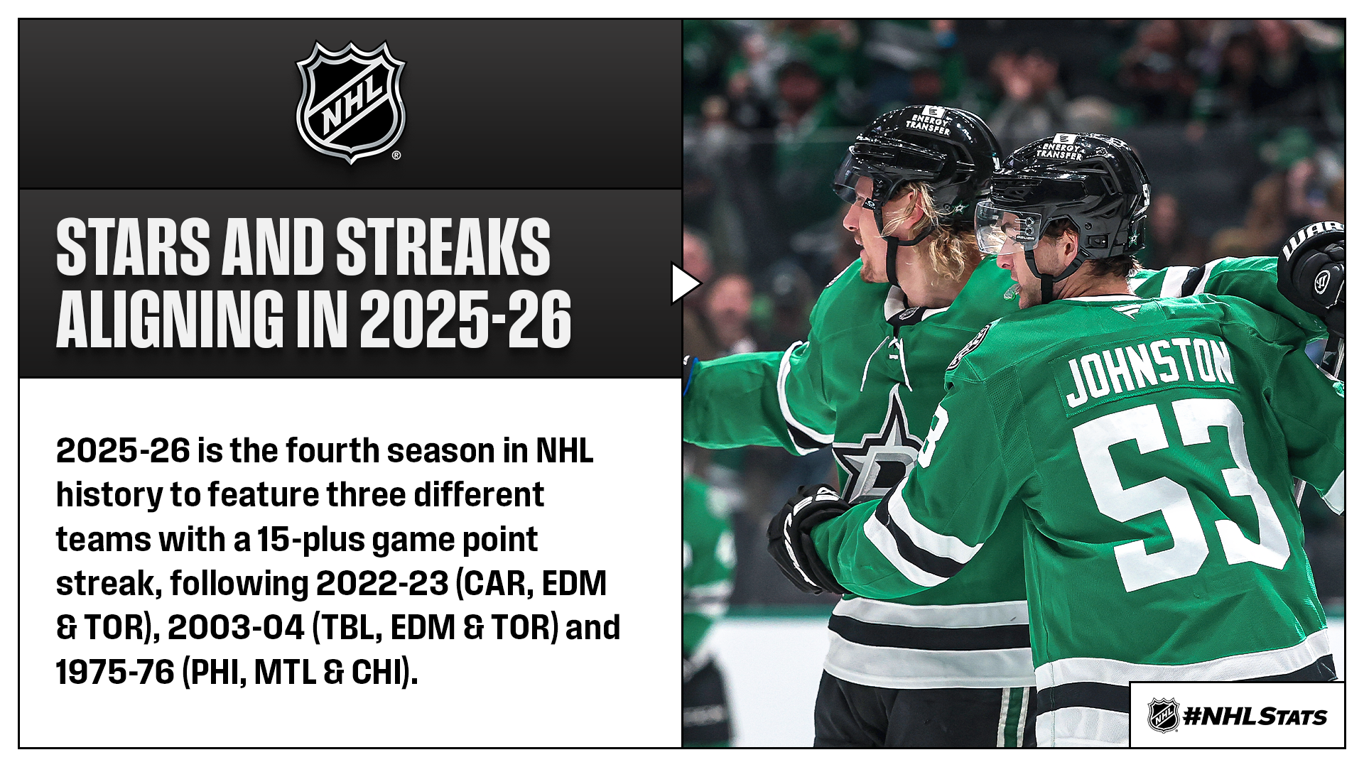 * The Stars became the third team to post a point streak of 15-plus games this season, following the Avalanche (17 GP from Oct. 26 – Dec. 2) and Lightning (15 GP from Dec. 20 – Jan. 23).