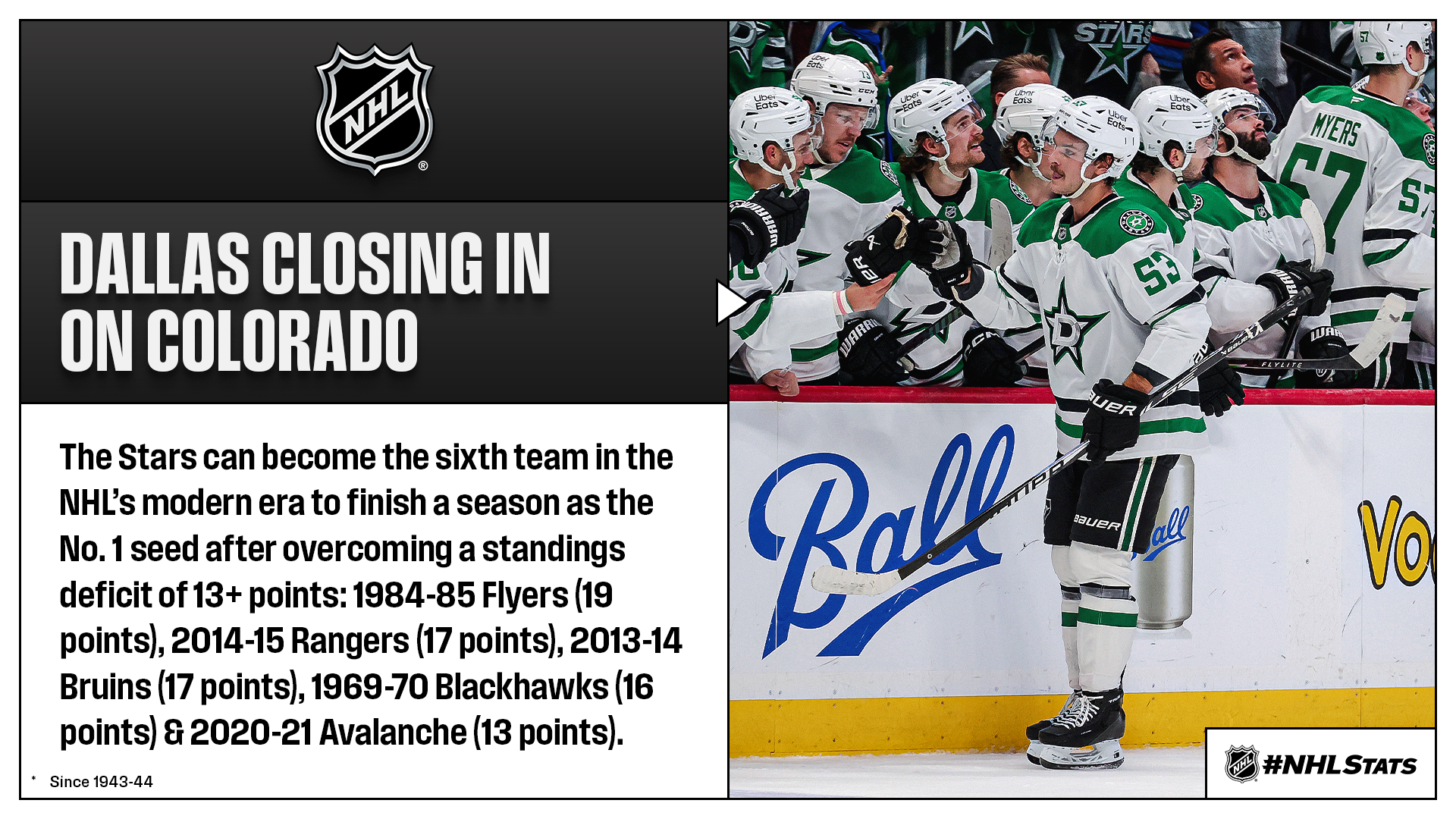 * The Stars defeated the Avalanche in a shootout to move within two points of Colorado at the top of the League standings. Overall, four contests required extra time Wednesday, bringing this season’s total to 281 – the most at this stage of a campaign (1,082 GP) in NHL history.