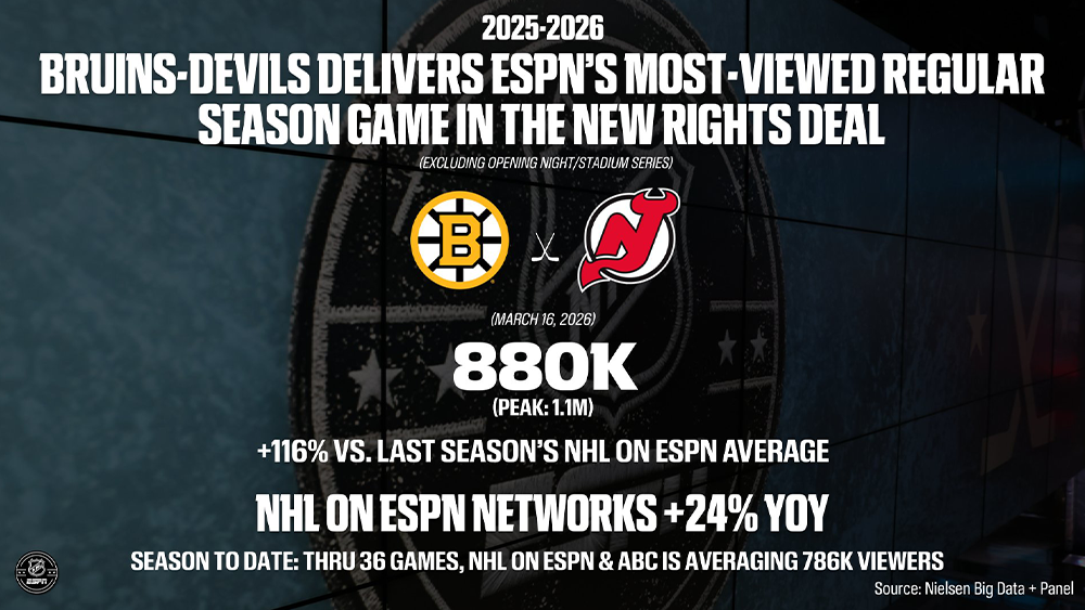 * Bruins–Devils deliver ESPN’s most-viewed regular-season game in the new rights deal