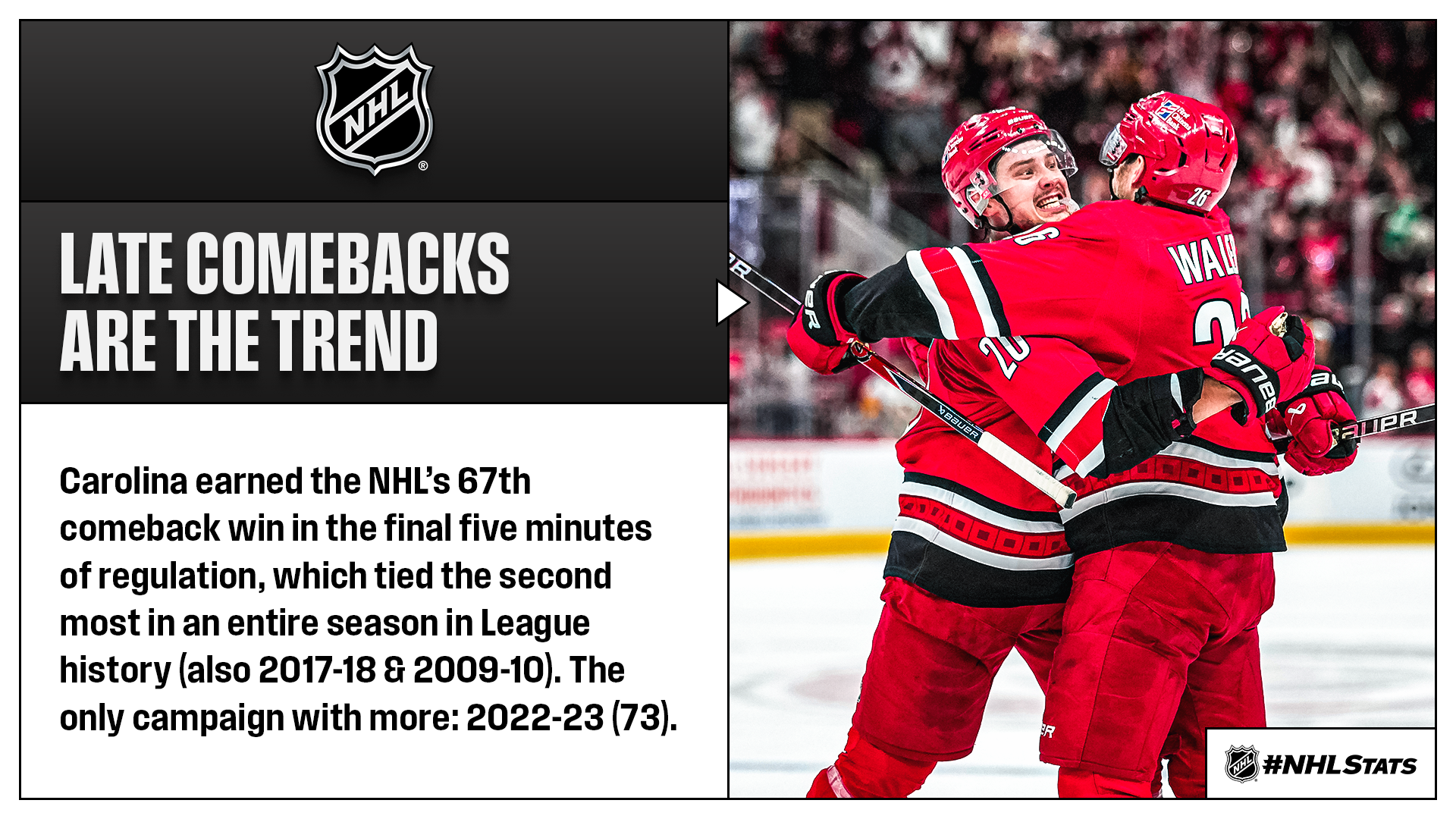 The Hurricanes outlasted the Penguins in a third period that featured a record-tying four game-tying goals. Carolina earned the NHL’s 67th comeback win in the final five minutes of regulation, which tied the second most in an entire season in League history with 230 games still left to contest in 2025-26.