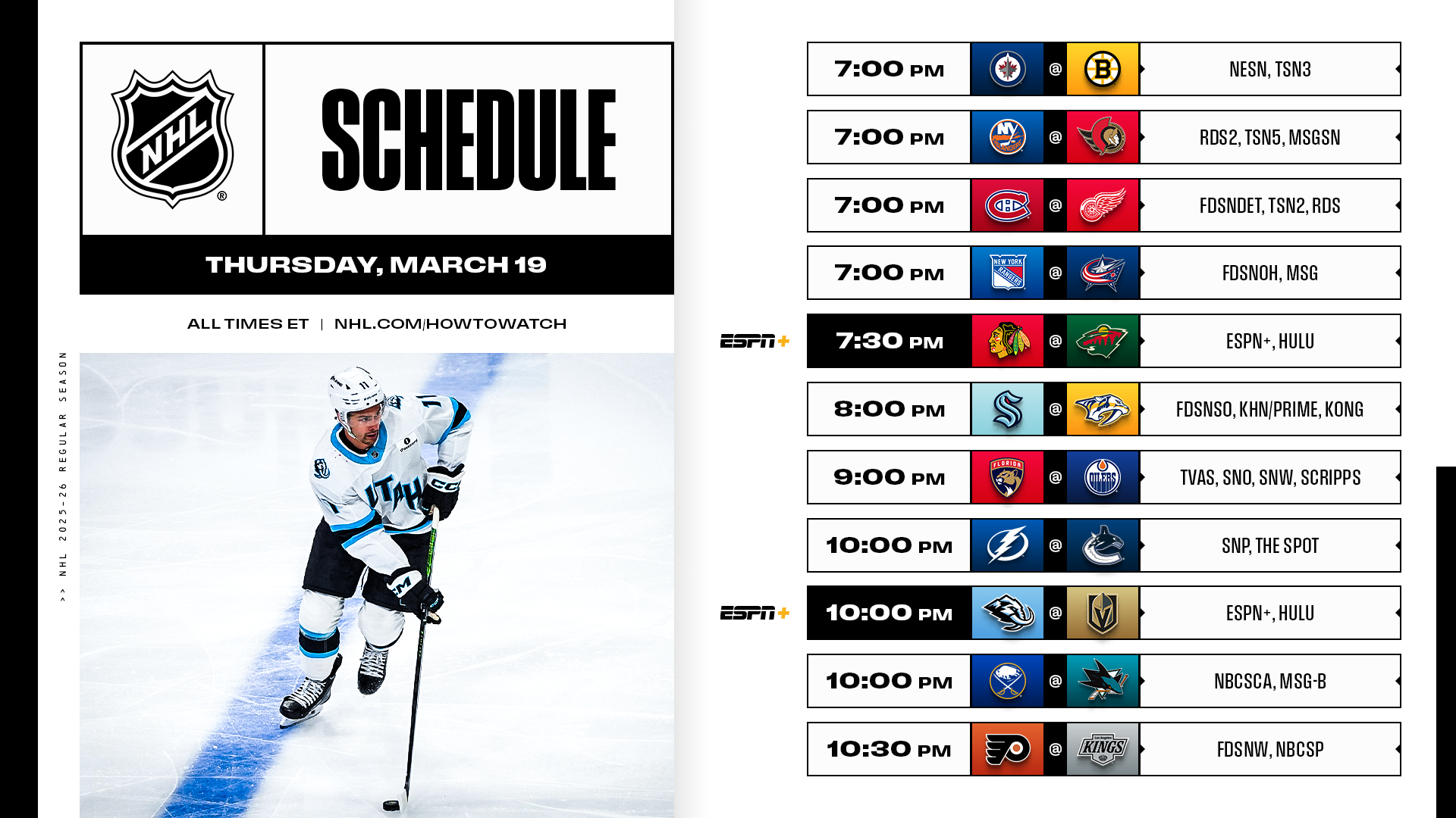 * Thursday’s slate is highlighted by a two-pack on ESPN+ that closes with a pivotal game in the Western Conference playoff race between the Pacific Division’s third-place Golden Knights and the Mammoth, who hold the first Wild Card position.