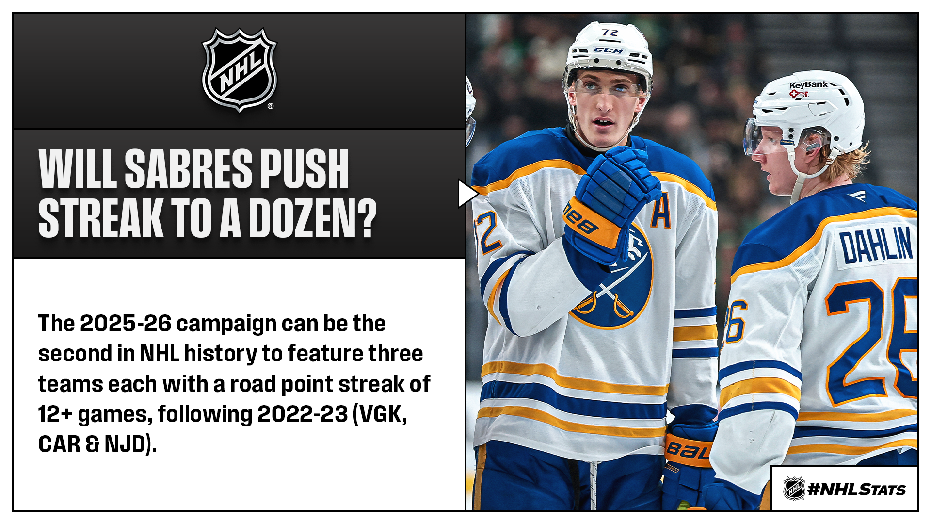 * The Sabres set a franchise record their last time out by extending their road point streak to 11 games (10-0-1). They’ll look to push that stretch to 12 when they visit Macklin Celebrini (60-98—158), who’s nearing 100 career assists, and the Sharks. Buffalo can become the third team this season with a road point streak of at least a dozen contests (TBL & DAL: 13 GP).-19120345.png)