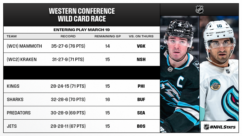 * The Mammoth and the Kraken (31-27-9, 71 points), the NHL’s two newest franchises, hold the first and second Wild Card position, respectively, with the closest four teams chasing them – all within four points of the final playoff position – also in action on Thursday.