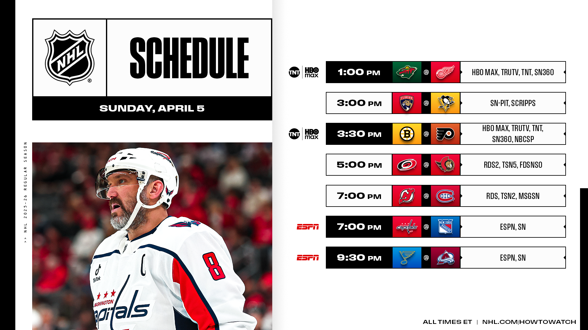 * The traditional broadcast of the Capitals–Rangers game will be available on ESPN in the first half of a doubleheader capped by the Blues (32-31-12, 76 points) battling the League-leading Avalanche (50-15-10, 110 points), with each contest also carried by Sportsnet in Canada. Sunday is also set to feature a pair of NHL on TNT matinees involving the Wild (43-21-12, 98 points) visiting the Red Wings (40-28-8, 88 points) followed by the Flyers (38-26-12, 88 points) hosting the Bruins (43-26-8, 94 points).