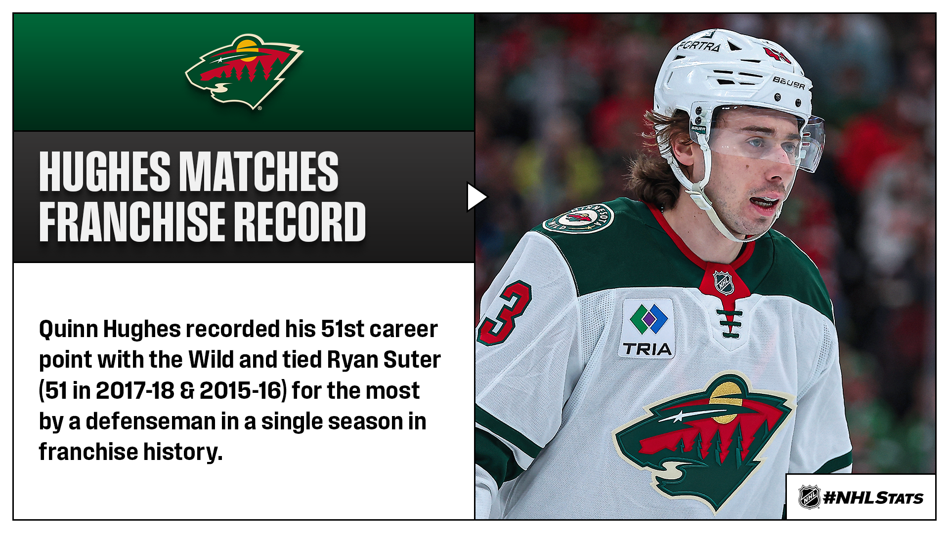 * Quinn Hughes (0-1—1) factored on one of four Minnesota goals and matched a franchise record as the Central Division’s third-place Wild (43-21-12, 98 points) defeated the Senators (39-27-10, 88 points) at Canadian Tire Centre. Hughes boosted his 2025-26 totals to 6-68—74 and tied Phil Housley (68 in 1992-93) and Brian Leetch (68 in 1991-92) for the most assists through 70 games in a season by an American defenseman in NHL history. Forty-seven of Hughes’ assists have come since he was acquired by Minnesota on Dec. 12 (4-47—51 in 44 GP), tying him with Mikko Koivu (47 in 2008-09) for the ninth most in a single season in Wild history.