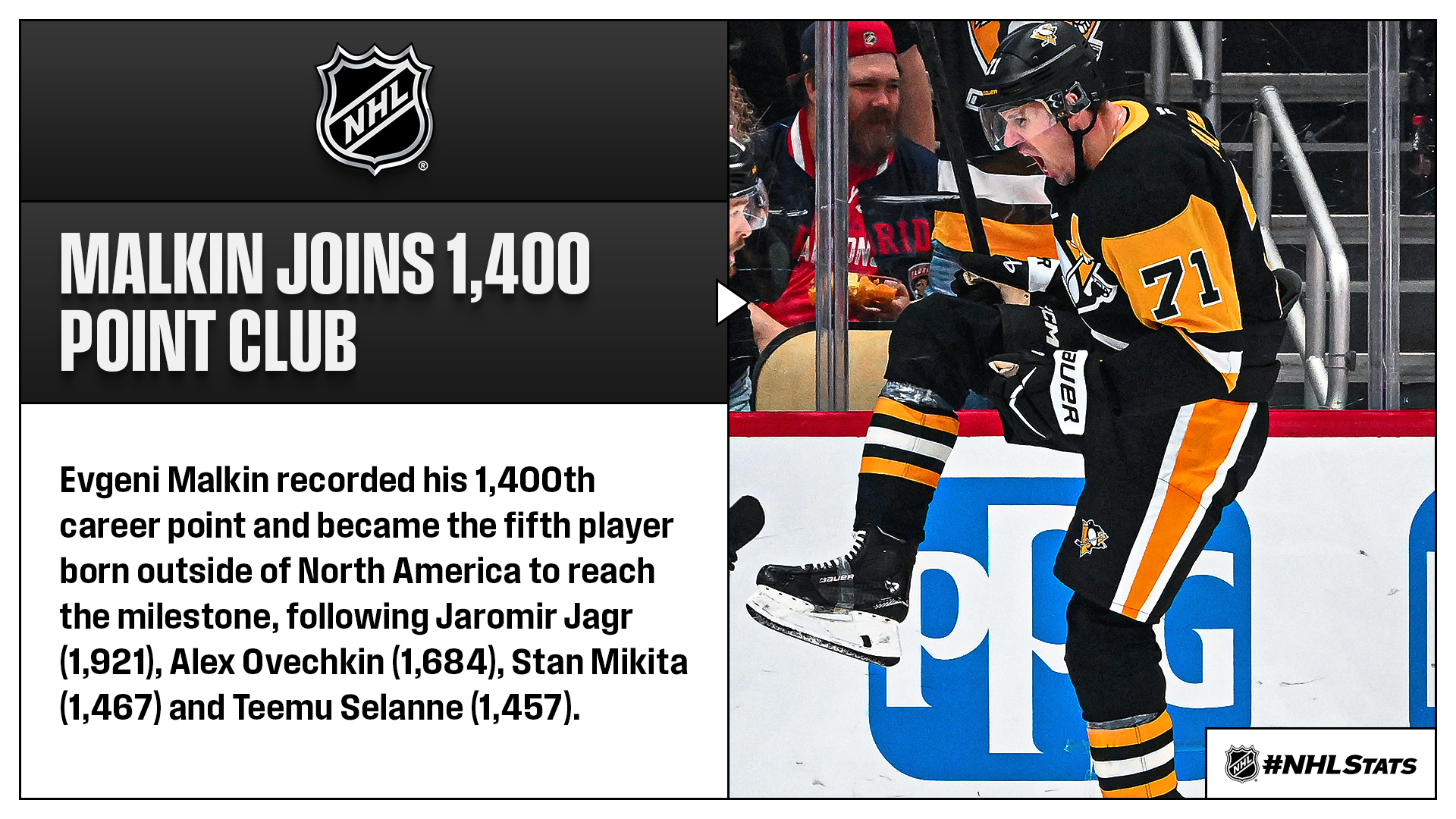 * With his first goal of the game, Malkin became the third active player to reach the 1,400-point milestone, following Crosby (1,756) and Alex Ovechkin (1,684). However, Malkin wasn’t done there – the 39-year-old found the back of the net two more times and became the oldest player in Penguins history with a hat trick.