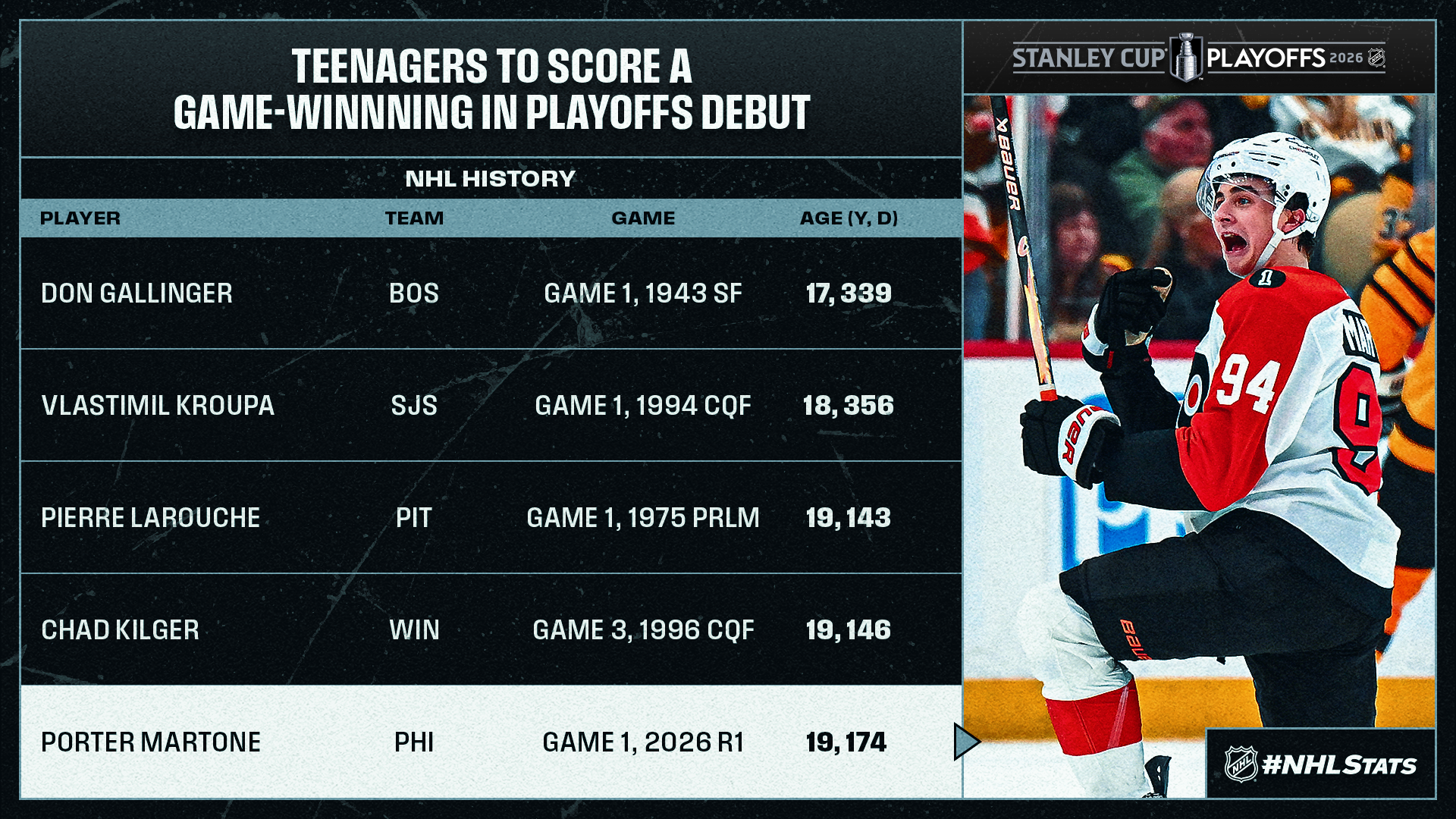 * In a regular season that concluded with Gen Z accounting for 60% of NHL players and 23 players who competed as a teenager, Martone continued his goal-scoring ways after entering the 2026 Stanley Cup Playoffs with the most tallies among all Flyers players (tied) since making his League debut on March 31. Overall, Martone became the youngest Flyers player to score in his postseason debut, ahead of Simon Gagne (20 years, 44 days, Game 1 of 2000 CQF).