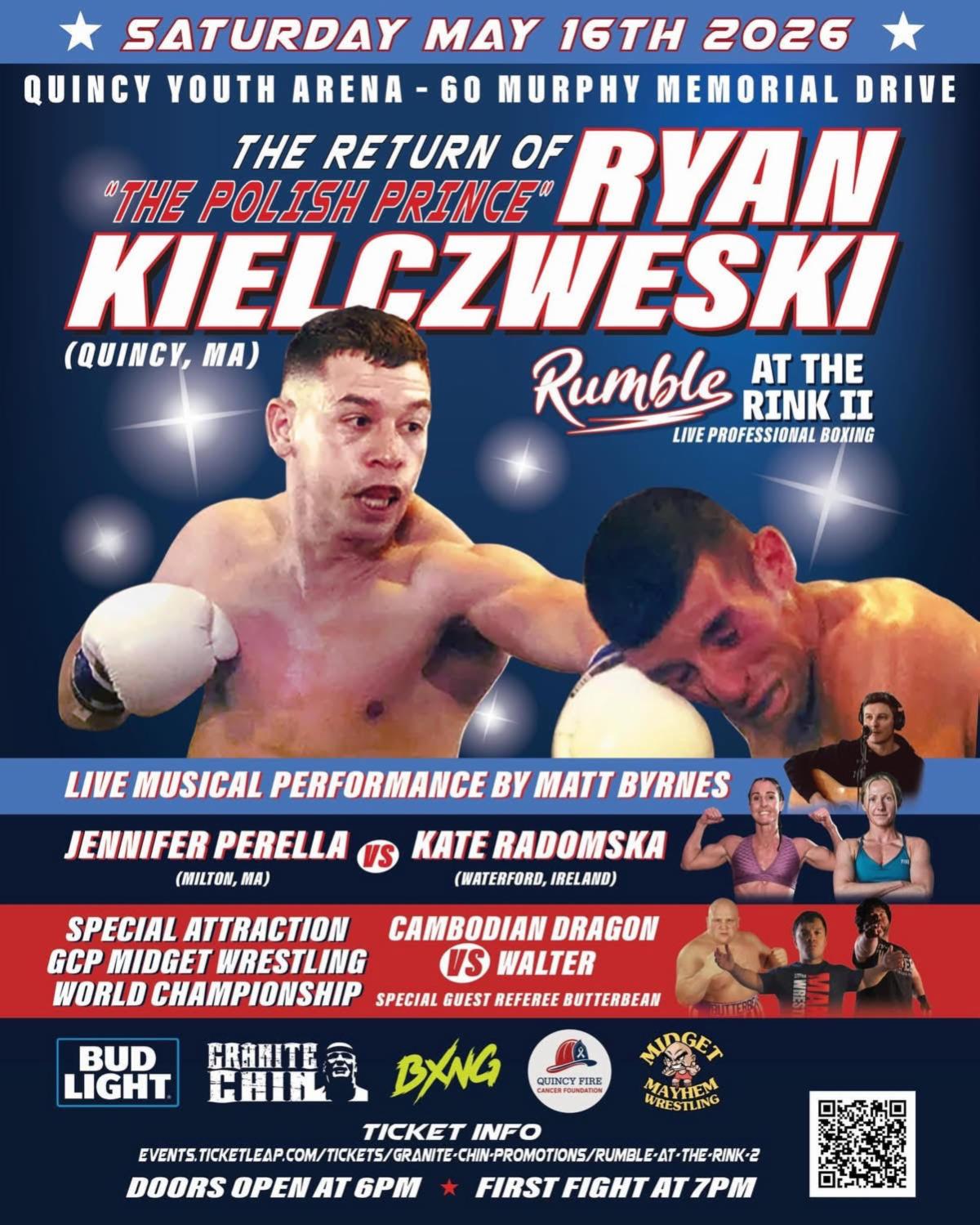 “I guess I’m just too stubborn to go down,” Kielczweski joked. “Boxing is something I’ve done since I was 6; it’s been like a job for me, and I’m looking forward to getting back in the ring again. We’re all going to have a good time on May 16th in Quincy.”