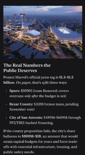 A normal person would see all of this and wonder how on earth anyone could move forward on this project. The project’s main source of data has been deemed to be worthless by every independent person. It makes sense that a mayor would see this and want everyone to stop so a reevaluation could be done. But not in today’s world. According to some media outlets, if you question the CSL report, you are deemed to be a “Project Marvel foe” rather than a normal human being who wants the economics to make sense. The San Antonio Current found that the mayor has “little support from council or city staff.” One councilman cried about the mayor “creat(ing) a rift” with local leaders by wanting this pause. Apparently, the mayor wanting an actual independent economic analysis is causing her to “butt heads” with paid-off city leaders. This same councilman admitted in a radio interview this week that the city council STILL doesn’t have an agreed term sheet with the team. The city doesn’t even have a signed document with the team that simply outlines the terms of the deal.