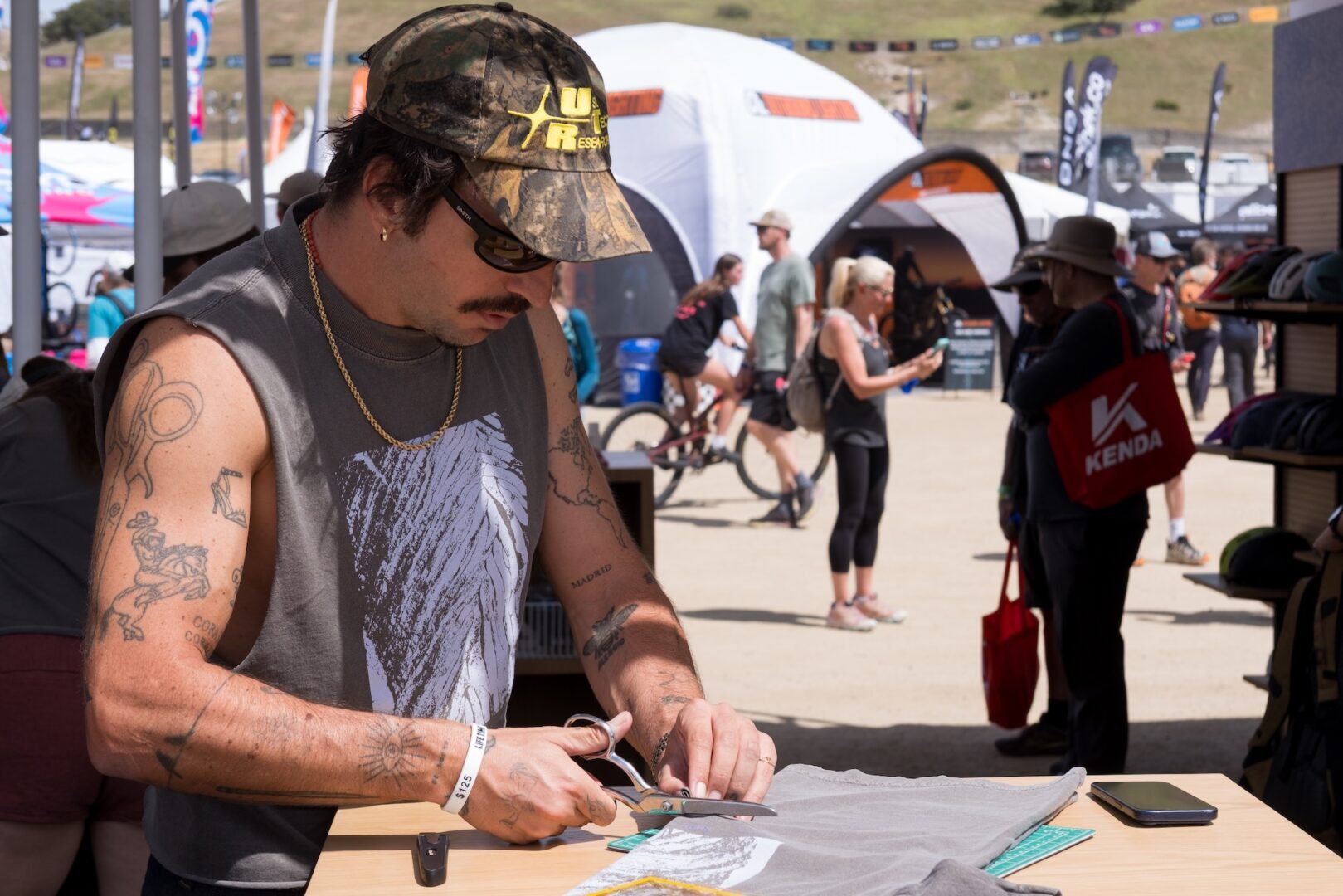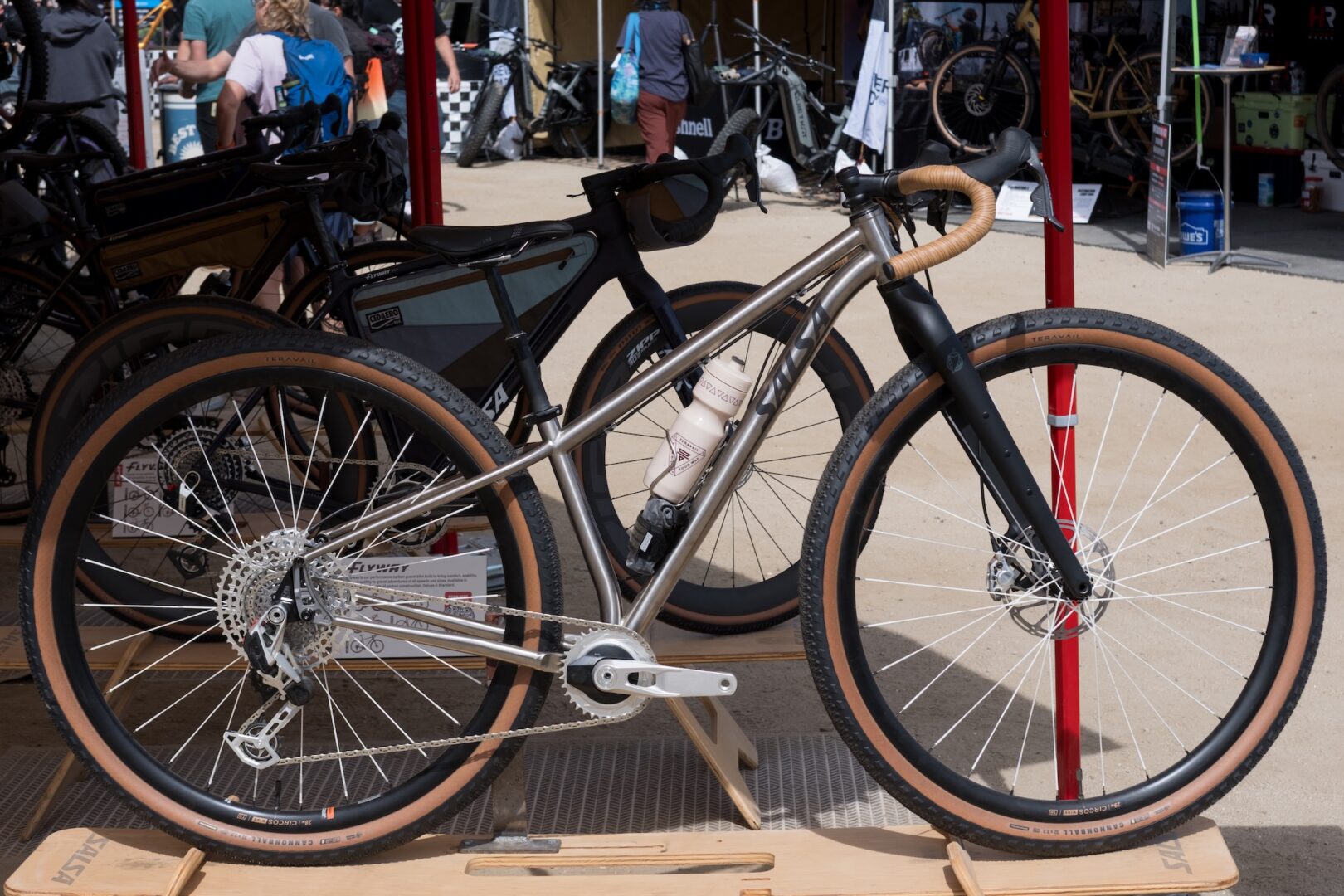 Innovation also appears in unexpected forms. While 32” wheels are still in their infancy within mountain biking, Salsa Cycles has already experimented with bringing that format into gravel. Around the expo, creativity extends beyond products: breakfast burritos served by Topeak, a T-shirt cropping station at the Smith booth to look as cool as Cesar Villalba, and even a live concert hosted by Canyon Bicycles to close out the day.