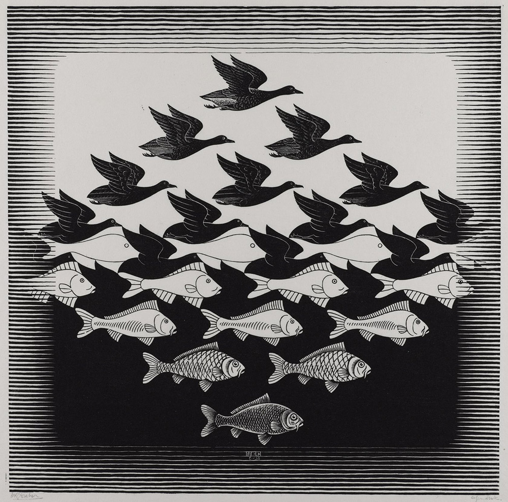 Since I was in college, so I’ve been a fan of M.C. Escher’s work. My favorites are images where the background is gradually filled in, while the foreground disappears, until—in the drawing above—fish in the water become birds in the sky. There’s no distinct line where the fish switch to birds—it’s a gradual transition.