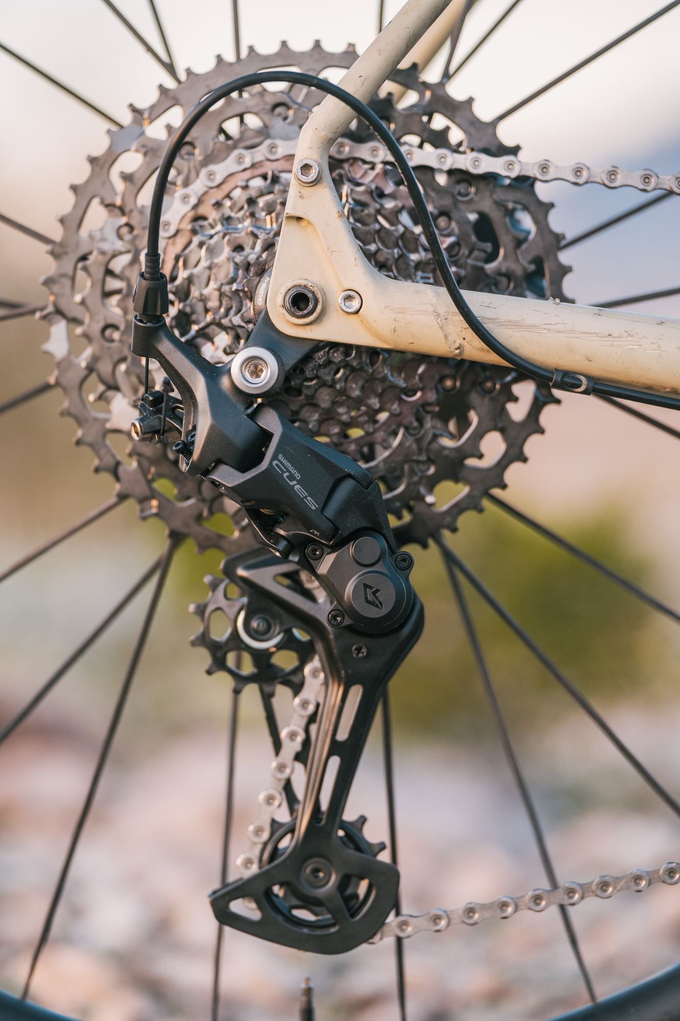 This is the same derailleur I used on my last Cues flat bar review, and it once again passes the “damn well good enough” test. The only issue I’ve had with these Cues derailleurs is a cracked plastic washer that holds the B screw adjuster, a minor part, and the derailleur still functioned; it just required some care when removing and reinstalling. I wound up replacing it with the more robust Deore XT Linkglide derailleur as it shares the same 1:1 cable pull ratio. I love that the derailleur has a barrel adjuster, as I just went to great lengths to add one to a derailleur.