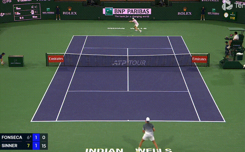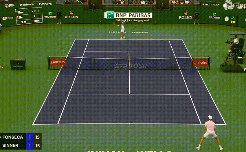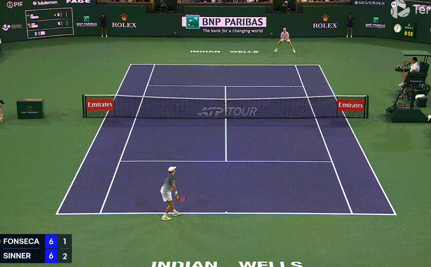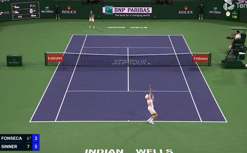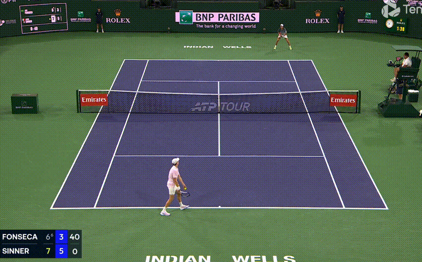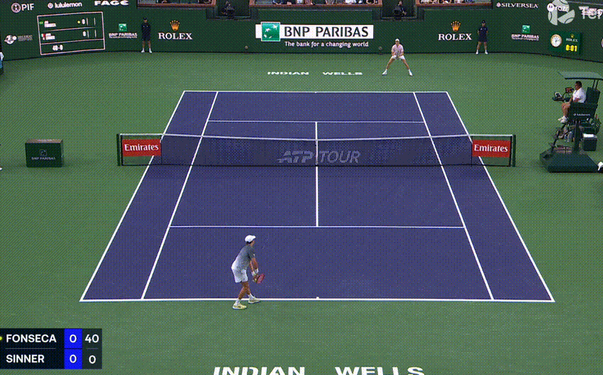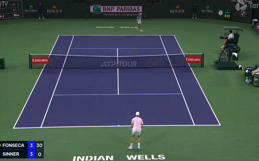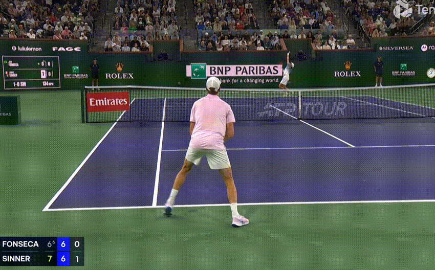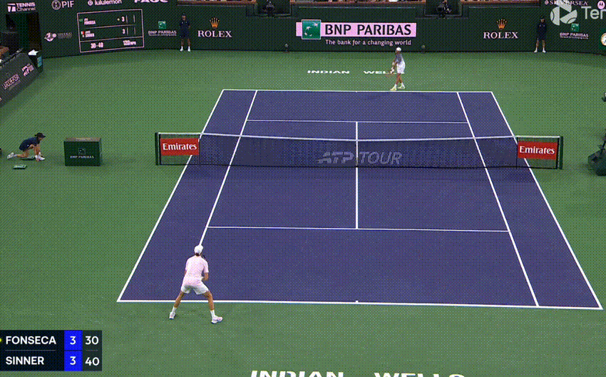 Fonseca faced another break point at 4-4. He hit another second serve big, this time at 118 mph. It was a calculated risk, given the quality (8.2!) — and positioning — of Sinner’s return, which was smothering Fonseca after his serve:
