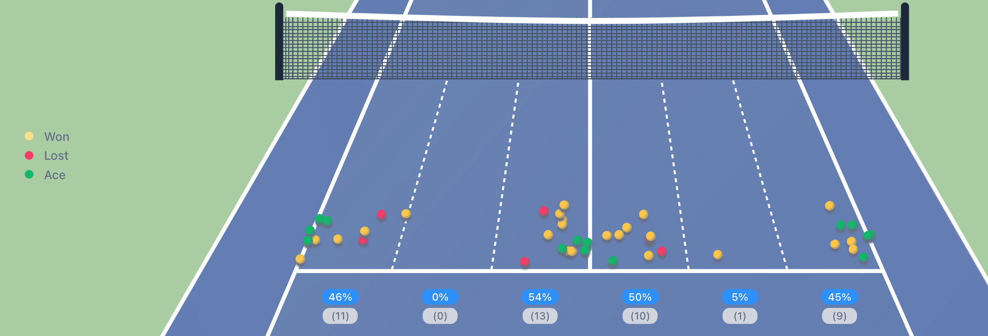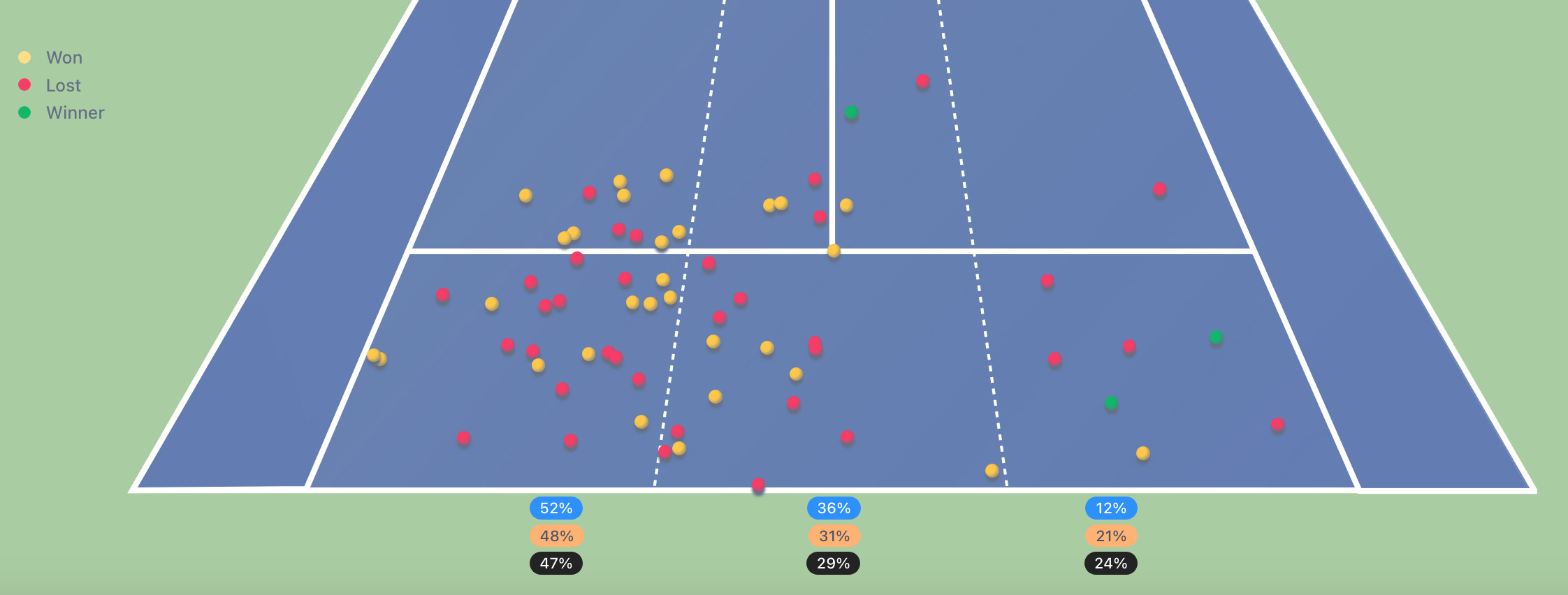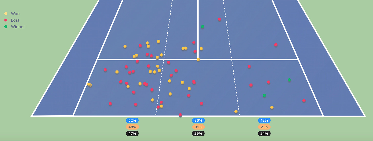 In fact his line backhand is one of the things I’ve liked most about his game from the start. He takes it line 34% of the time — a full 10% more than the tour average — as a way to funnel traffic back into his apocalyptic forehand. That’s been a key feature missing from other serve +1 hopefuls in the last ten years (Tsitsipas as poster boy).