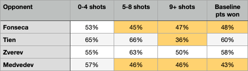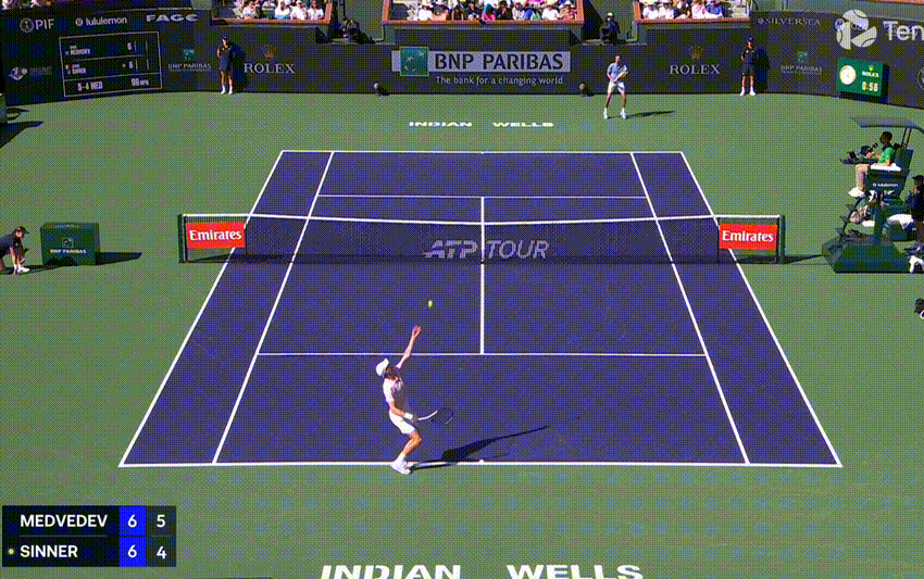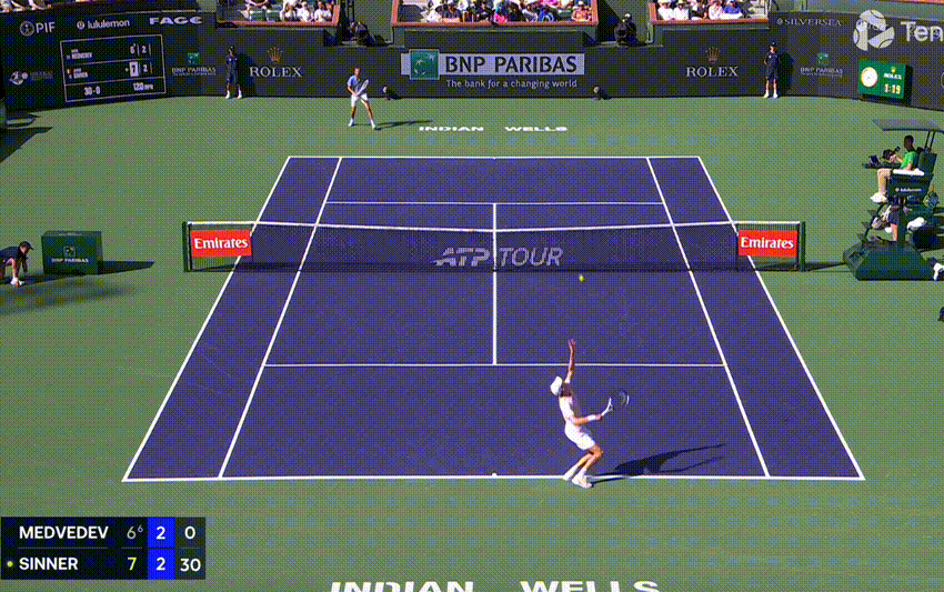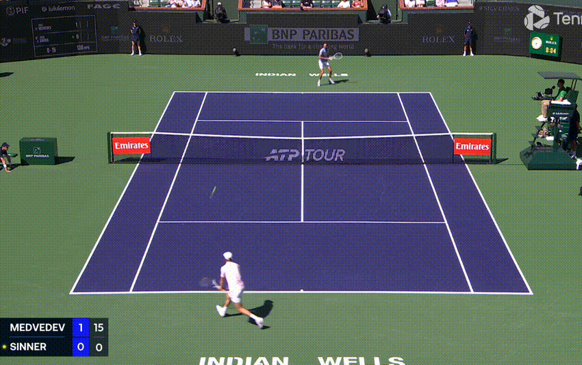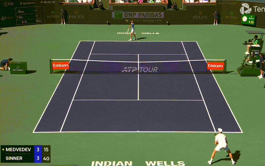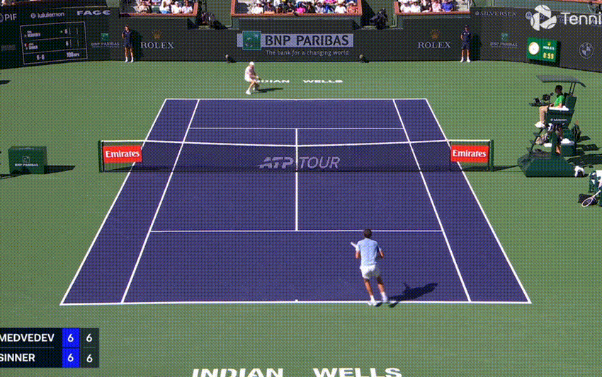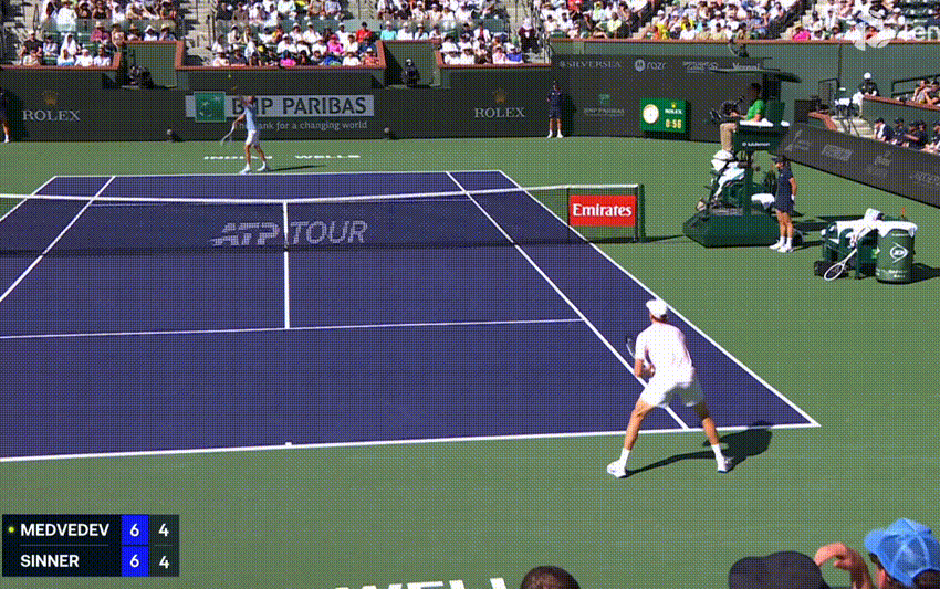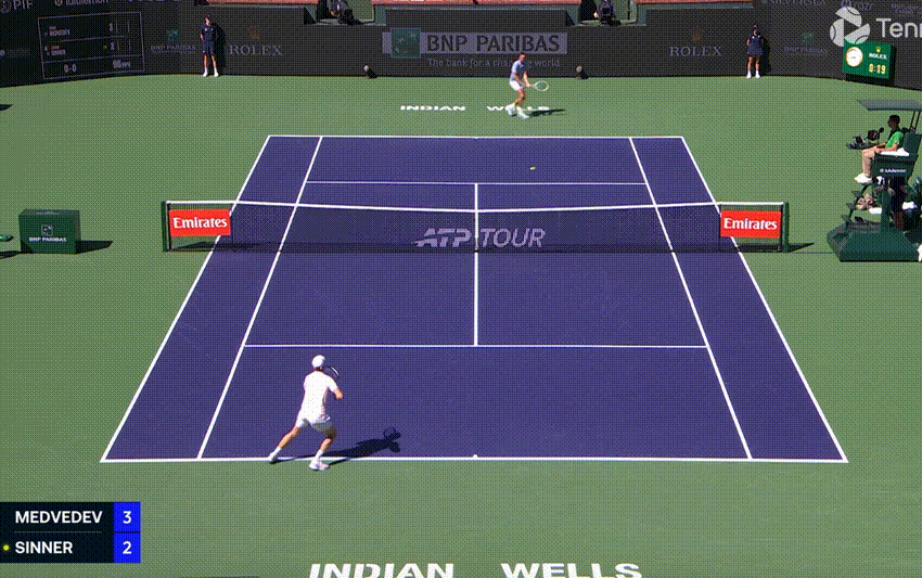 From Sinner’s end of the court, what has been interesting to observe is the juxtaposition between his groundstroke game and serve performance. Dare I say the Italian’s baseline game in Indian Wells has been a little underwhelming when using his “I’m a computerised slingshot sent from the future to destroy you” yardstick. He didn’t do well in the longer rallies against any of his last four opposition, and he straight up got smoked by Medvedev in the baseline game on Sunday: