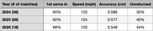 But shoutout to James for raising the question in the Fonseca/Sinner comments: is Jannik Sinner a top-10 server now? It’s still too early to say of course, but I did a little digging courtesy of Courtside Advantage, and it’s interesting to note that Sinner has been this accurate for months, stretching back to the beginning of the ATP Finals. Here’s his serve accuracy for each match since post-US Open technical serve tweaks were made: