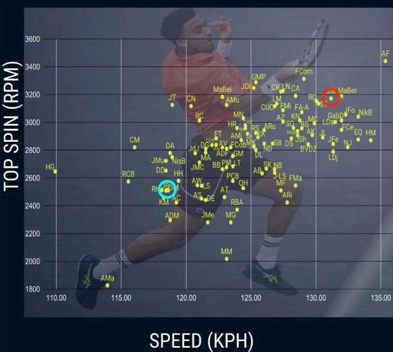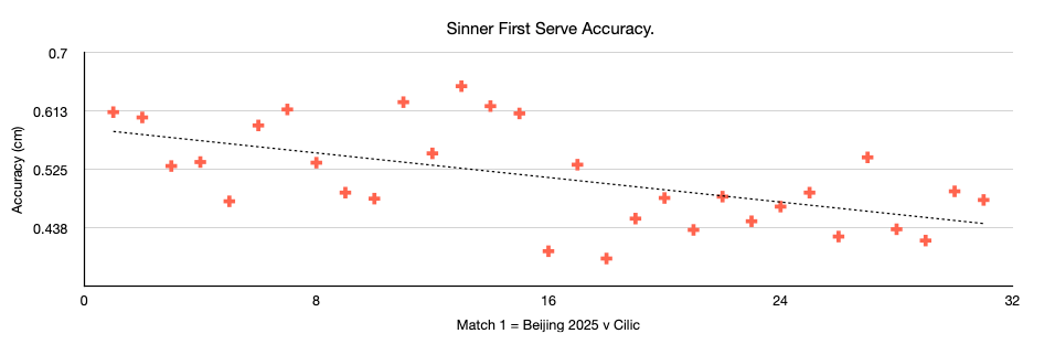Here’s the chart I posted after the brilliant Fonseca match from Matt Willis again, this time with Sinner’s Indian Wells tournament average pointed out, which is literally off the chart: