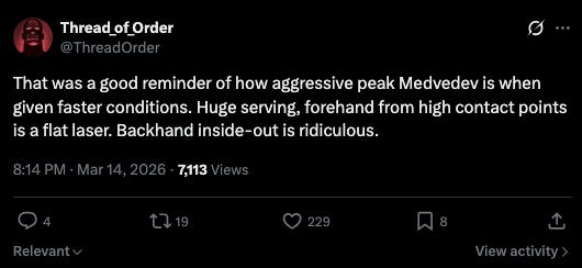 While many predicted a Sincaraz final before the semifinals (hey, me too), Medvedev had other ideas, ending Carlos Alcaraz’s unbeaten run in 2026, and reminding us all that he was the premier hardcourt player in the world not so long ago.