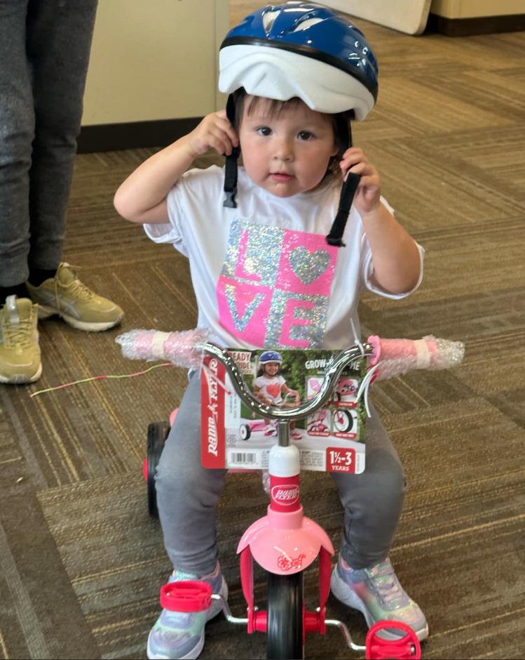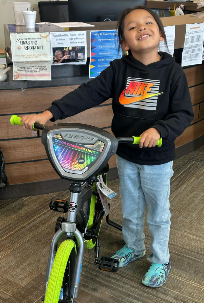 “We did a Bike Day for Children in Poplar on the Fort Peck Indian Reservation. We had council members there to hear about what safety is needed, so kids can bike safely in town. All participants were enrolled members of the Fort Peck Tribes. There were many children who attended along with their families. We gave away bikes and had stickers and other little gifts for all the children. One child, who is in foster care, won a Frozen bike and was so excited! One girl who donated her [old] bike won a new bike. It was a good time for the community to enjoy time with their children, grandchildren, and family. It helped 87 kids get a new helmet and we have a few left over in case someone needs one.” — Sunee Erickson, Fort Peck Tribal Elves