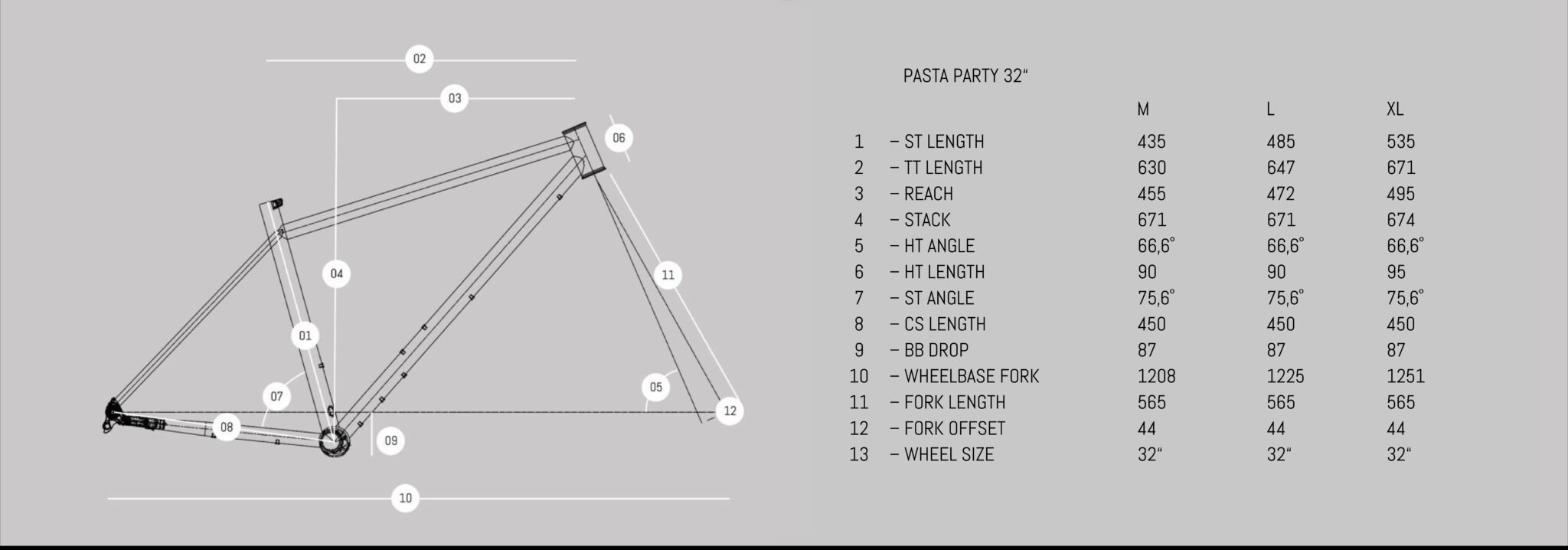 - We refined the geometry so that stack, reach, and weight distribution stay close to the classic Pasta Party feel — just optimized for the bigger wheels.