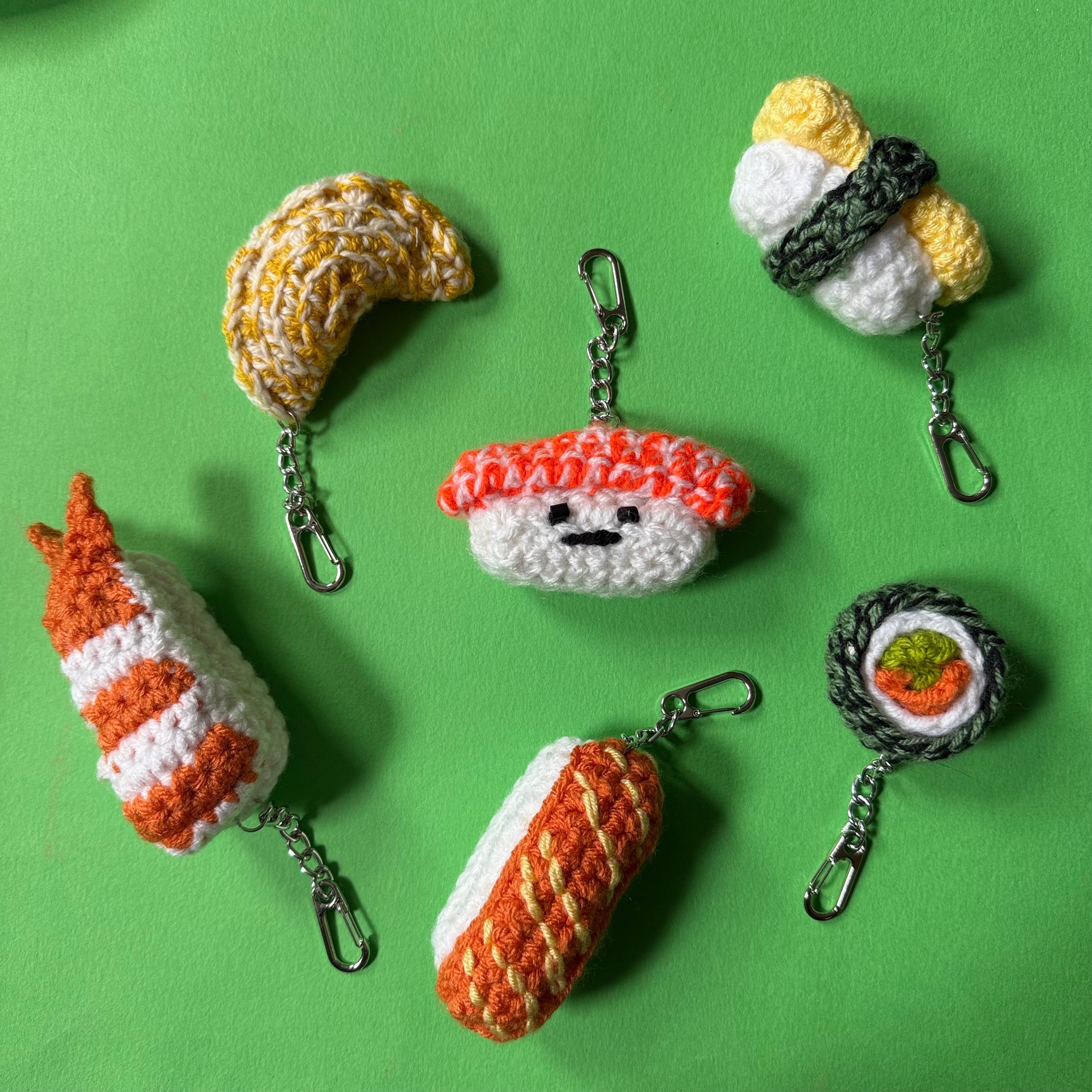 i’ve been working hard this morning and probably the whole week on these sushi charms made from offcuts of wool and yarn that I had lying around.