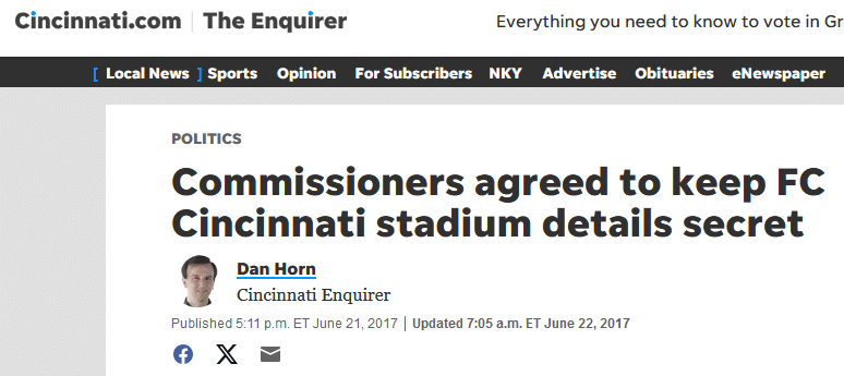 But it happens all over the country. Before FC Cincinnati began pushing city officials to let the team build a soccer-only stadium and receive hundreds of millions of taxpayer dollars, FC Cincinnati approached several city officials asking them to sign NDA’s that would restrict them from talking about any of the stadium details before the entire thing was agreed upon.