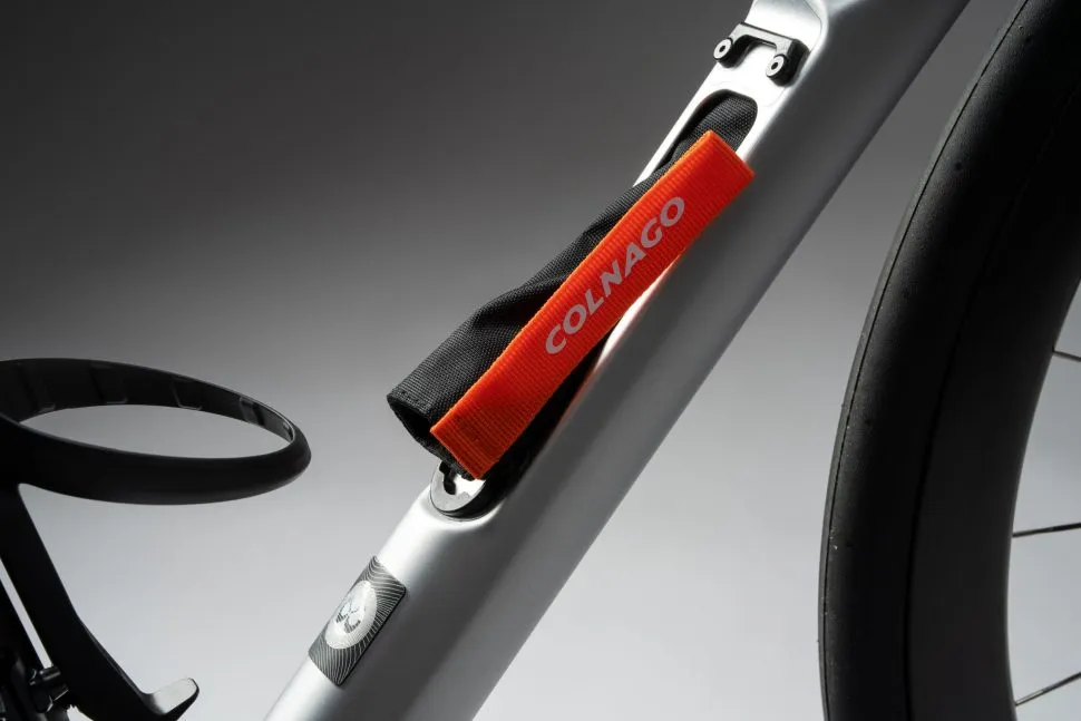 Colnago has also added downtube in-frame storage, it says without detriment to frame stiffness. It includes a storage bag with a ratchet wrench, tool kit and CO2 inflator head and a TPU inner tube.