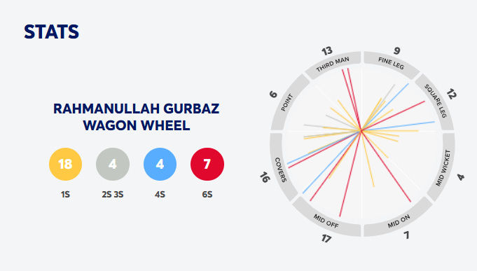 In this match, Gurbaz was well ahead of Ryan Rickelton in second place. If we look at per ball impact, Gurbaz was 0.94 while the latter was at 0.77. While he was at the crease, he made 69.4% of the team’s runs (including extras).