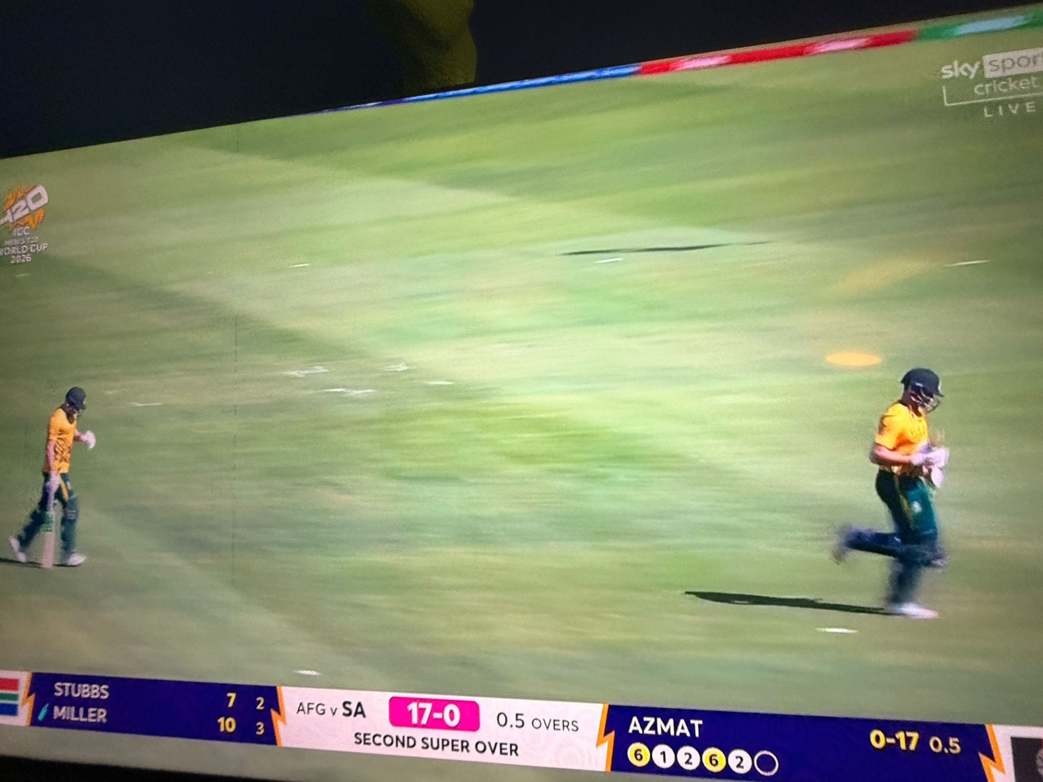 When Stubbs and Miller run confidently from the ground (with Afghanistan looking tired and sluggish), the score on the screen says they made 17 in that over. But that is because in all the chaos, the TV feed lost a six.