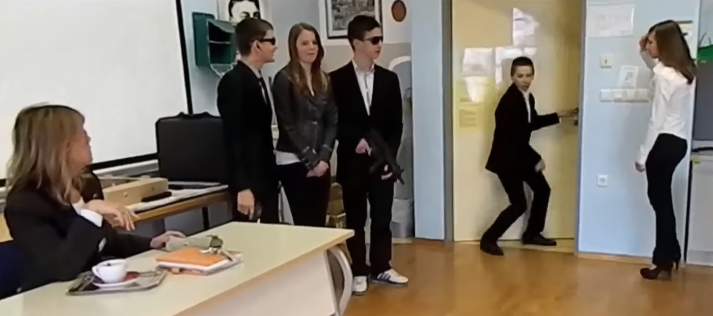26. A school classroom where two boys pose with shades and machine guns. But who is that making an entrance?