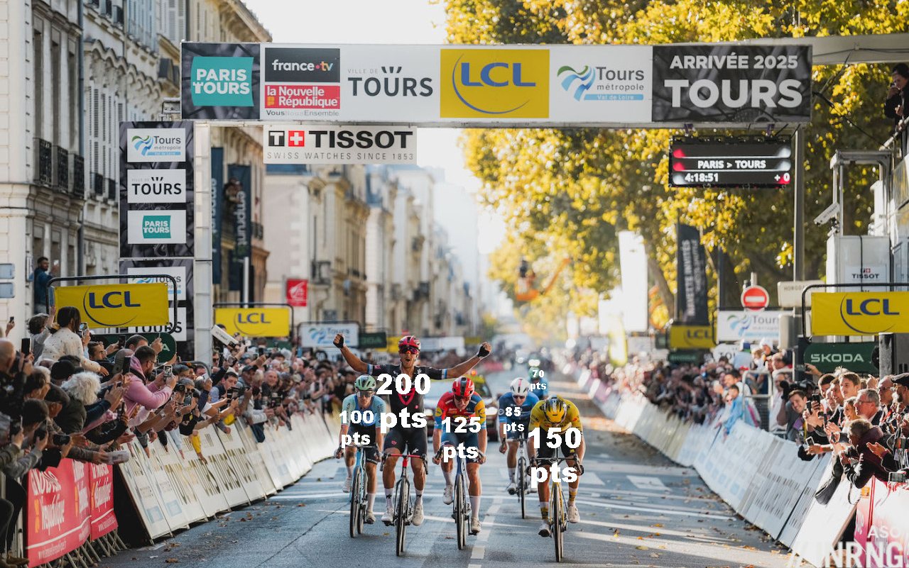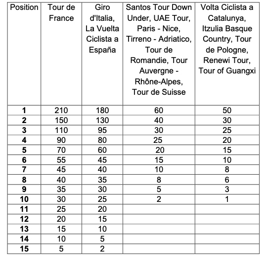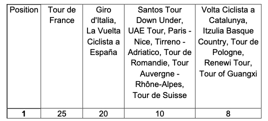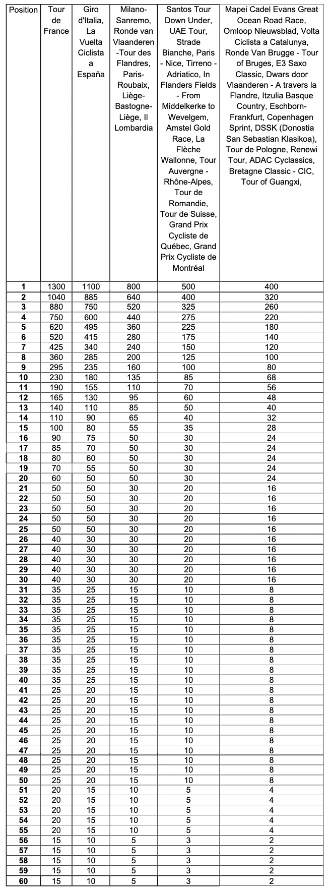 The table below is for the men’s World Tour races, if it’s a stage race then it’s for the final overall classification. Note the unusual numbers, 1,300 points for the Tour de France win for example rather than, say a round 1000 and then everything scaled proportionately to this.