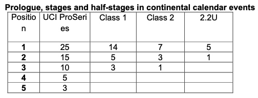 The next two tables below shows the points on offer for stages in non-World Tour races and the daily points for leading the race too. It’s just cosmetic but note the clumsy formatting, these tables just don’t seem to be designed with public consumption in mind.
