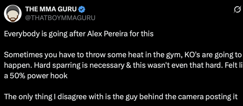 “Everybody is going after Alex Pereira for this. Sometimes you have to throw some heat in the gym; KOs are going to happen. Hard sparring is necessary & this wasn’t even that hard. Felt like a 50% power hook. The only thing I disagree with is the guy behind the camera posting it.”