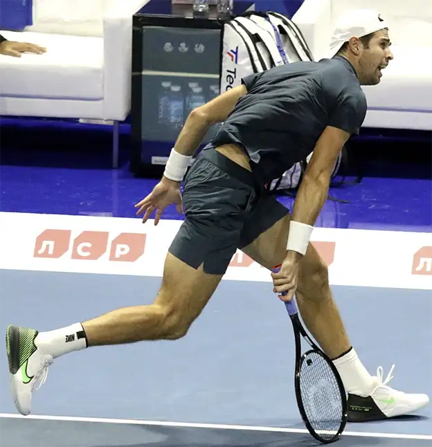 Giovanni Mpetshi Perricard rocks the Nike Vapor 11 and it fits his big, aggressive game very well. The Vapor 11 sits low to the court and feels fast underfoot, which helps him explode into big serves and quick first steps. It has a forefoot Zoom Air unit that gives a springy, responsive feel when he moves forward or shifts direction, and a TPU sidewall that provides solid lateral stability for those heavy baseline sprints and slides.