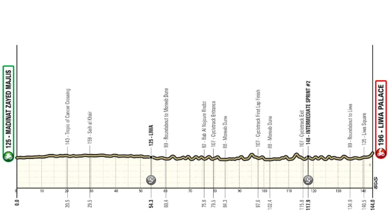 The opening stage kicks off with a ride south towards two laps of a 18km circuit before the peloton turns back on themselves to finish at Liwa. It’s a first opportunity to shine for the sprinters, though the final kilometre is slightly uphill, around 5%, which won’t help Jonathan Milan.