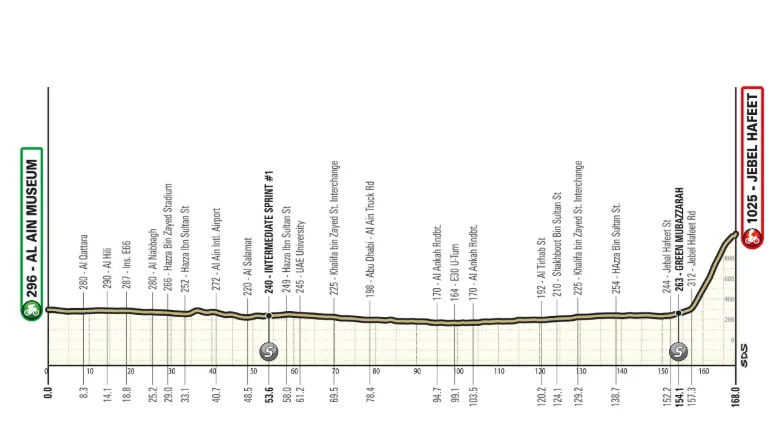 GC contenders will be eyeing the latter half of this stage as the race heads to Jebel Mobrah. The climb is split in two, hitting an average of 7% in the first 6.5km before spending the next 2km heading downhill. From there, the main test begins as riders are immediately confronted with a 17% gradient, which then peters out for an average of 12% in the last 5km.