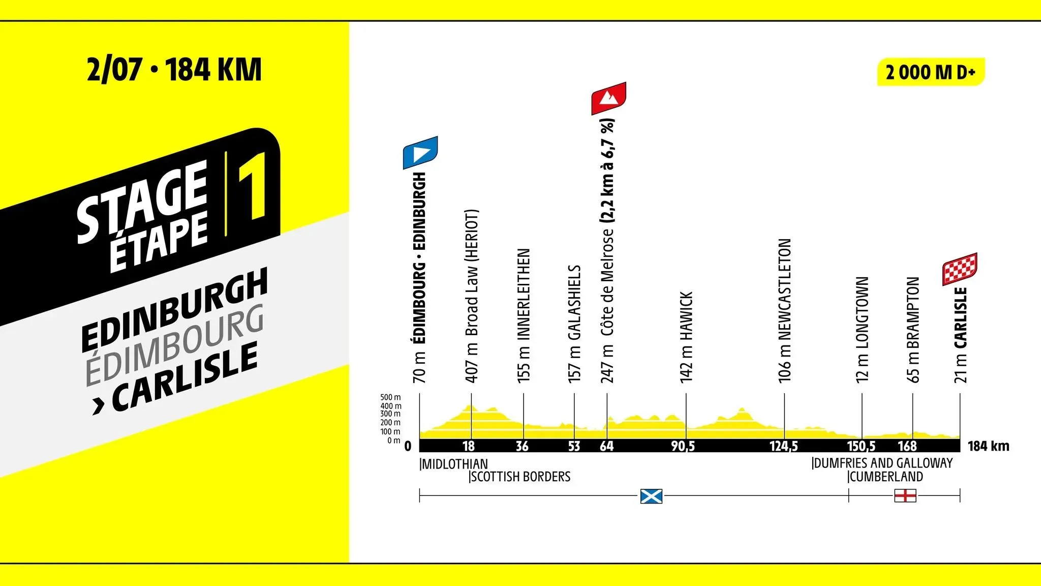 It passes over the only King of the Mountains climb of the ‘Côte de Melrose’ (2.2km, 6.7%) for the first polka-dot jersey while traversing the Scottish border, speeding past Dumfries & Galloway and into Cumberland to finish outside Carlisle’s medieval castle. The first yellow jersey is set to be one for the sprinters to fight out.