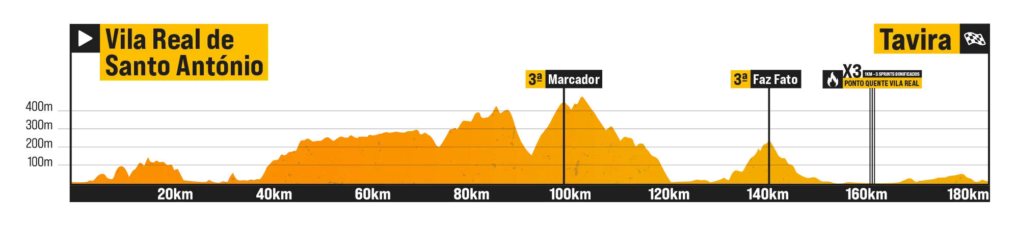 The race gets underway in the border town of Vila Real Santo Antonio. The first 50km will skirt along the Spanish frontier before turning towards the coast for a succession of two hills. The riders will pass through Vila Real Santo Antonio for a golden kilometre, featuring three bonus second sprints, before heading west towards Tavira on flat roads.