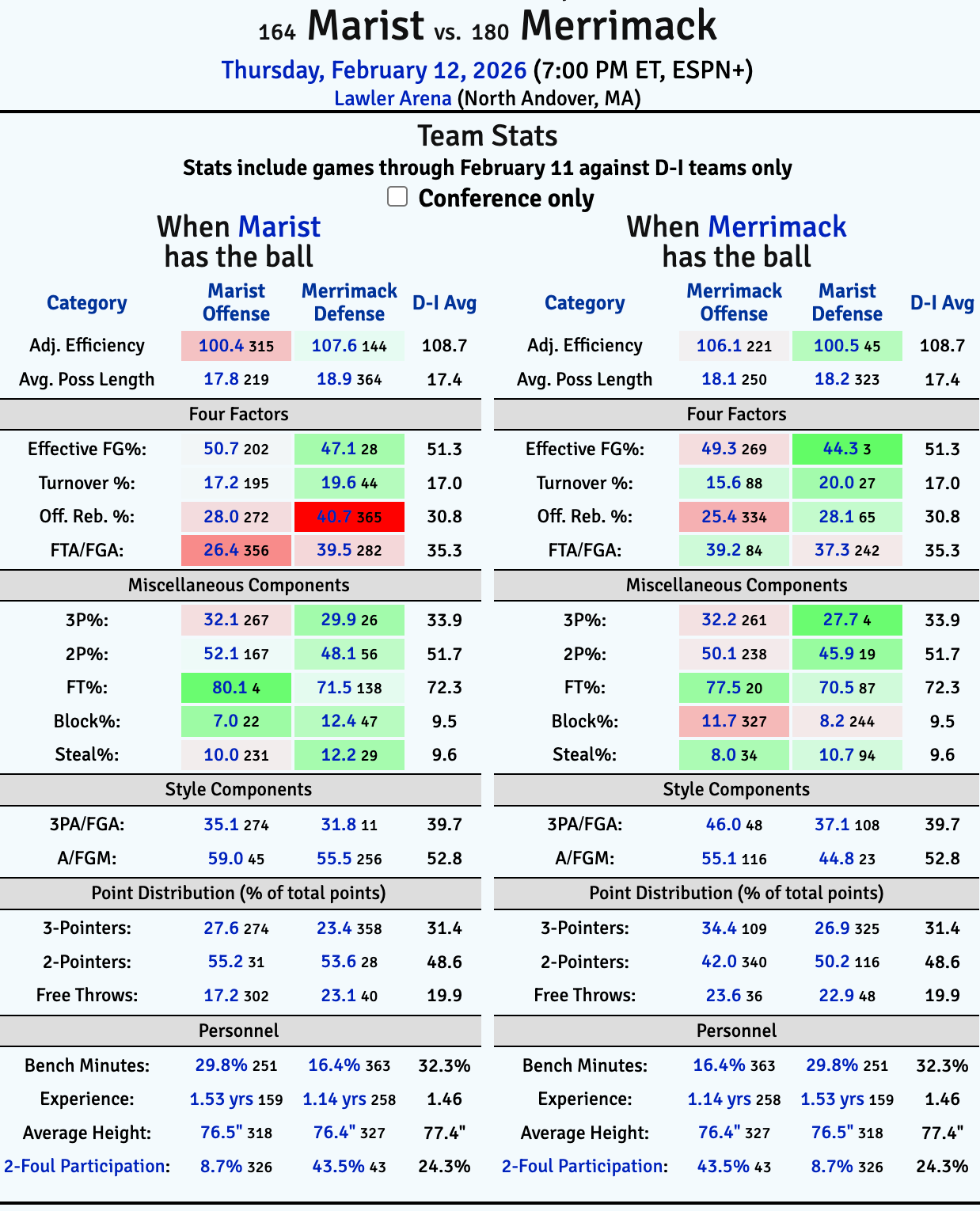 Merrimack enters the night at 16-9 overall and 12-2 in the MAAC, good for sole possession of first place. Marist comes in at 16-8 overall and 10-5 in league play, tied for fourth in the conference and looking to tighten the race as February turns toward March.