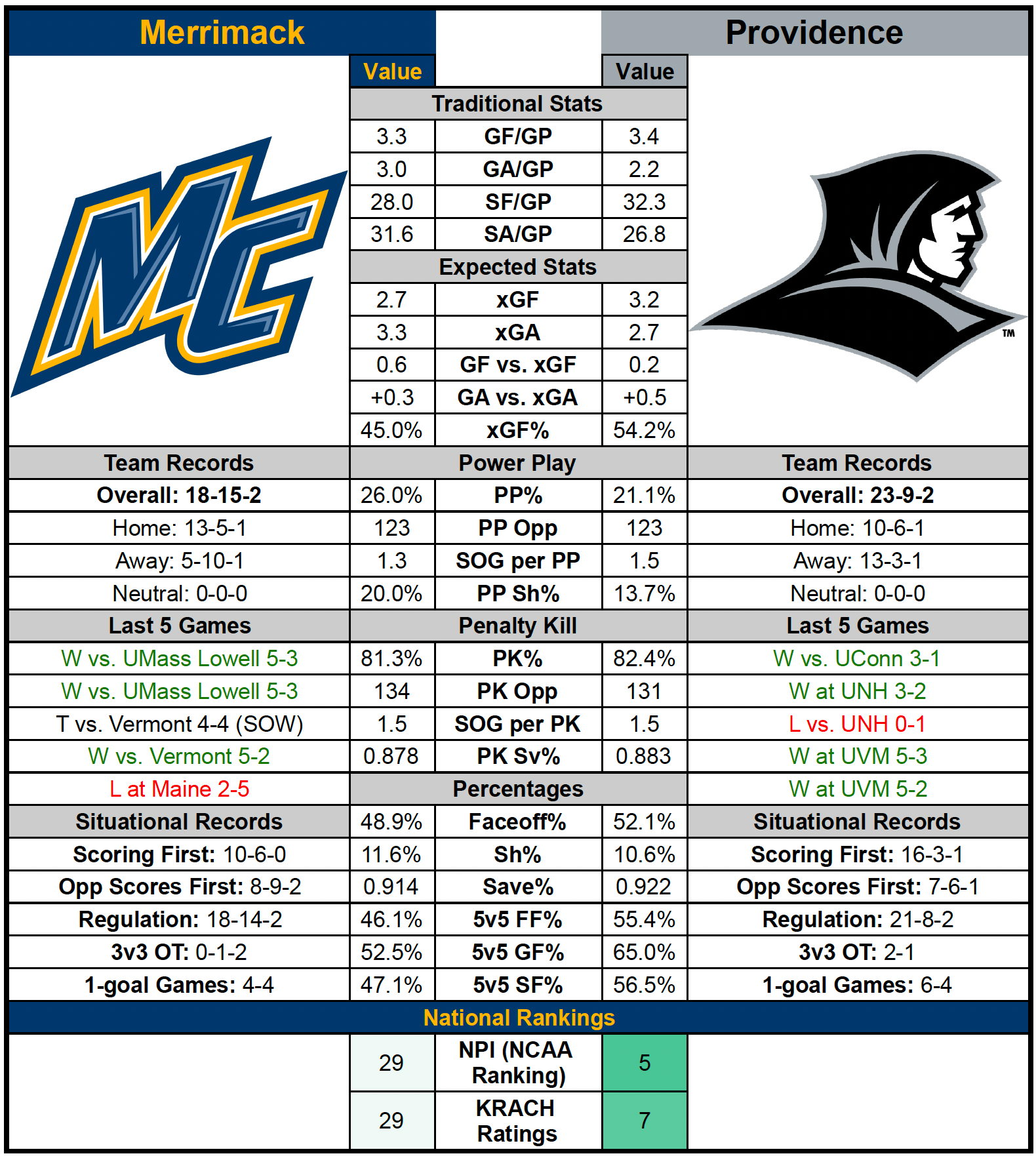 — The Warriors and Friars have only met once in the Hockey East Tournament. Providence swept Merrimack in a quarterfinal series during the 2015-16 season. The Friars shut out the Warriors in Game 1 behind 20 saves from Nick Ellis. Craig Wyszomirski scored in Game 2 for the Warriors, but the Friars won 3-1.