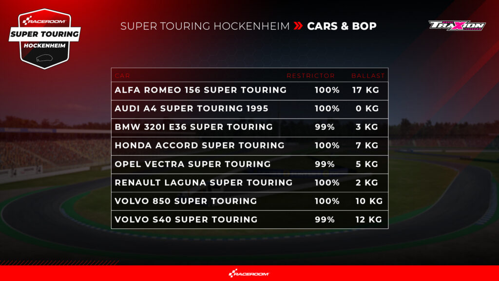 RaceRoom Super Touring Hocklenheim car lineup and BoP