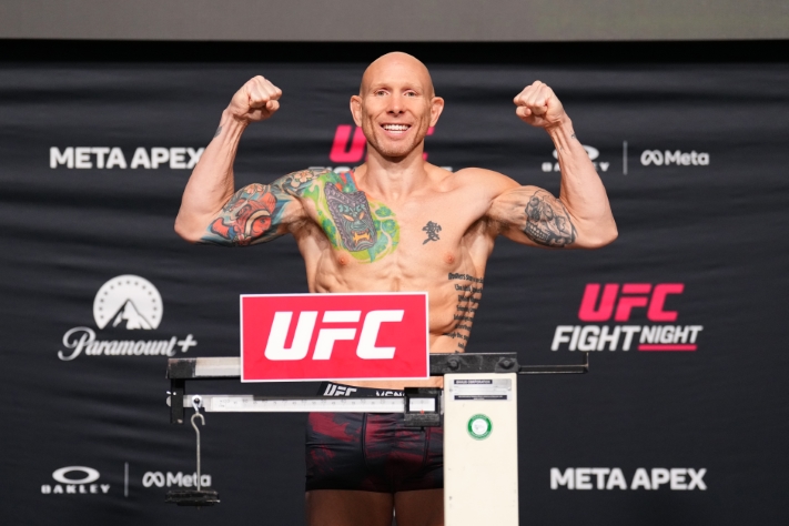 LAS VEGAS, NEVADA – MARCH 13: Josh Emmett poses on the scale during the UFC Fight Night official weigh-ins at Meta APEX on March 13, 2026 in Las Vegas, Nevada. (Photo by Chris Unger/Zuffa LLC)