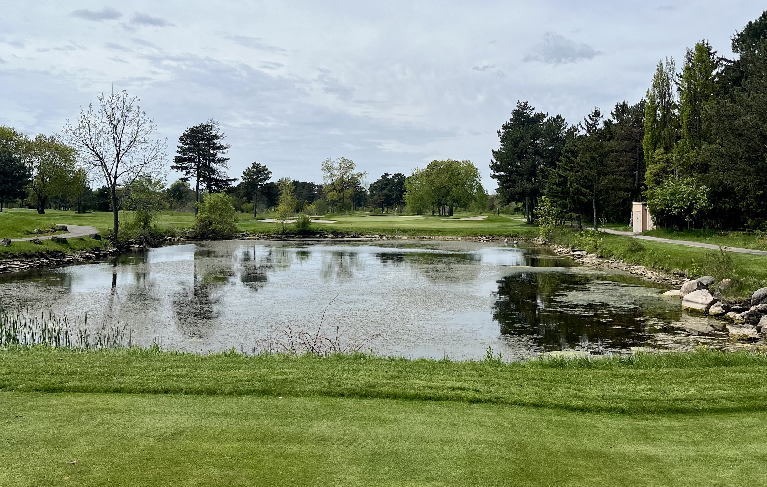 At 154 yards, the 14th hole is Whirlpool’s shortest par 3 by a wide margin and a pretty hole playing over a pond. This putting surface is rather flat but well-defended with four bunkers surrounding it.