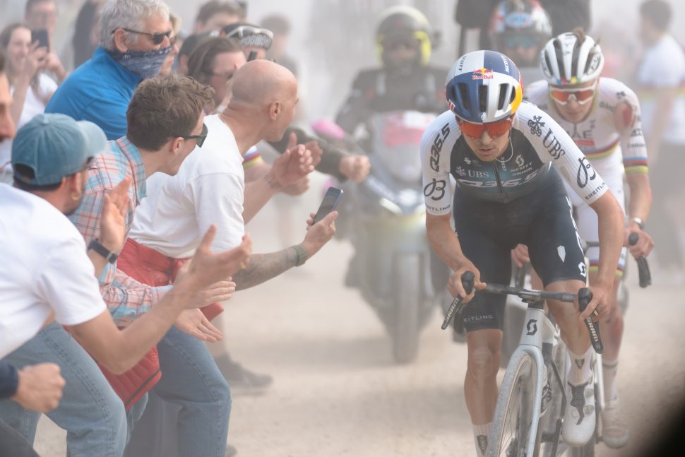 Pogačar’s three victories have come from long-range moves. Last year was a bumpier ride than normal though, having crashed while on the offensive with runner-up Tom Pidcock. Still, he’d bridge back to the Brit and drop him with around 20km remaining. In other words, not even a crash would stop the World Champ from taking the victory on Saturday.