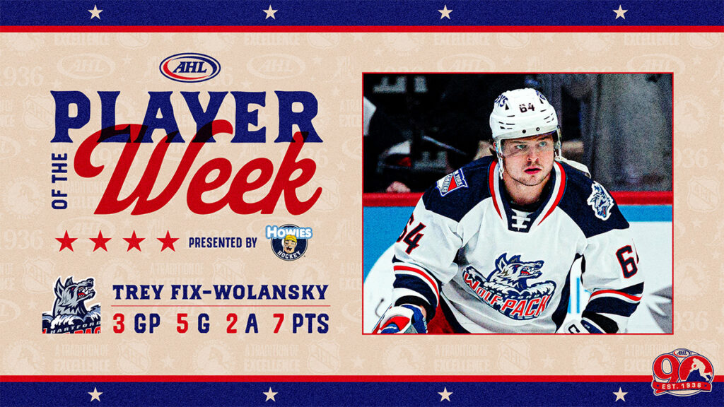 SPRINGFIELD, Mass. … The American Hockey League announced today that Hartford Wolf Pack forward Trey Fix-Wolansky has been selected as the Howies Hockey Tape/AHL Player of the Week for the period ending March 8, 2026.