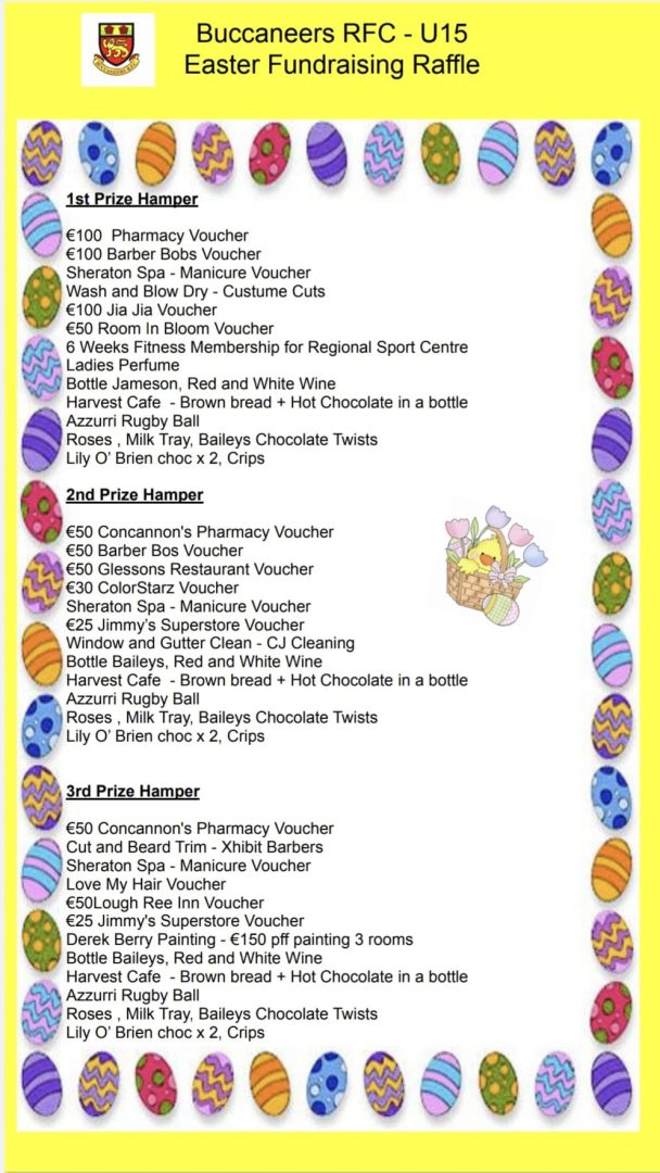 The U-15s have 3 super prizes on offer in their Easter Raffle and the draw will take place after their Cup match so there is still time to purchase tickets. Tickets are only €10 and you can Revolut payment to Geraldine at 0861732711 if you wish to support this raffle.